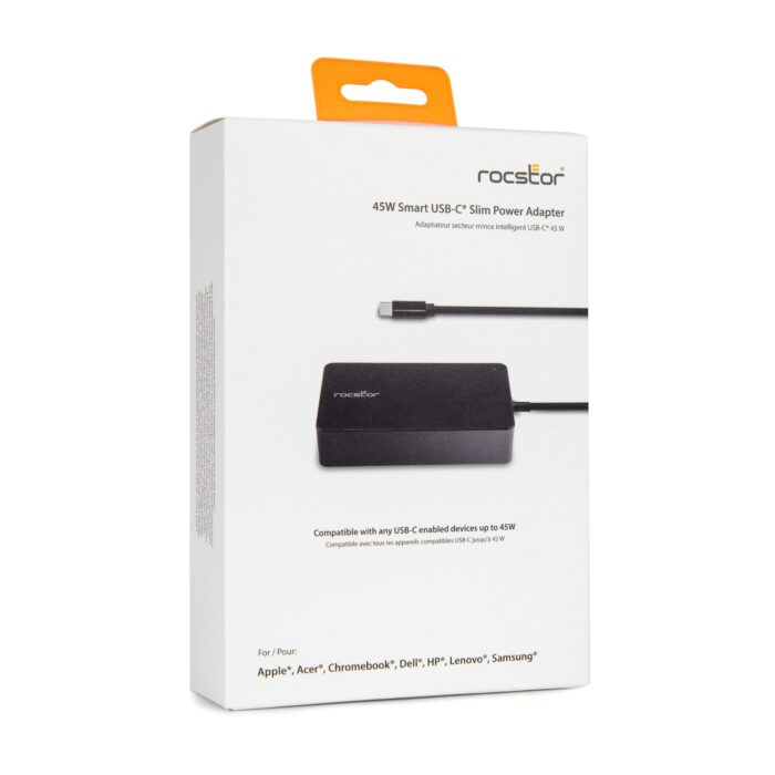 Marketing Information The Rocstor premium smart 45W USB-C AC power adapter charger is defined by its quality and durability. It is simply stylish, slim and reliable. This versatile universal USB-C charger is the best solution for users who require a second adapter or a replacement adapter for their laptop, tablet, or cellular phone. The 45 W AC Adapter from Rocstor is specially designed to meet the power needs of your laptop. Slim and powerful, this adapter enables you to simultaneously operate your system and charge its battery from electrical power outlets.