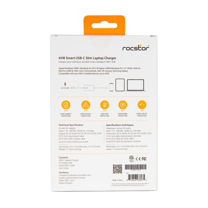 Rocstor 45W Smart USB-C Slim Power Adapter – AC Charger – For Apple® MacBook® (30W), MacBook Air® 2017 & higher, MacBook Pro® 13″, iPad®, iPad Pro® (35W), iPhone® , Chromebook®, Dell®, HP®, Lenovo® – Compatible with any USB-C–enabled Laptop device up to 45W – UL & FCC/CE Certified – Rugged – Size 3.58″x1.97″x0.92″ – 6′ Fixed USB-C Cable – 5ft UL Power Cable – AC110-240V – Black