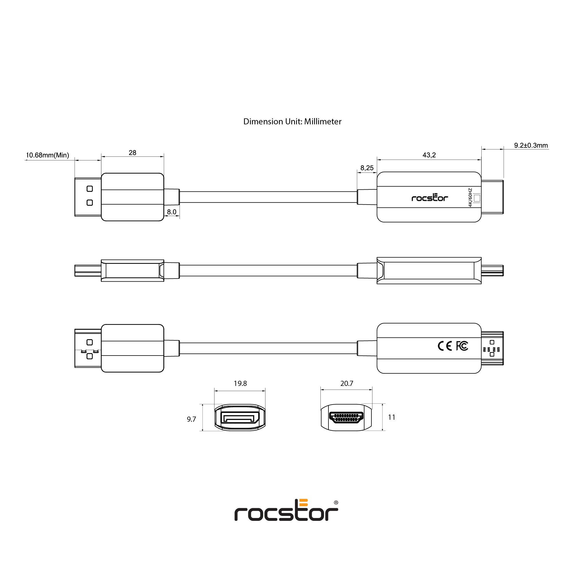 10ft – 3m HDMI Connector 43.2×20.7×11 mm – 1.7”x0.87”x0.43” DisplayPort Connector 28x20x9.5 mm – 1.1”x0.78”x0.37” |