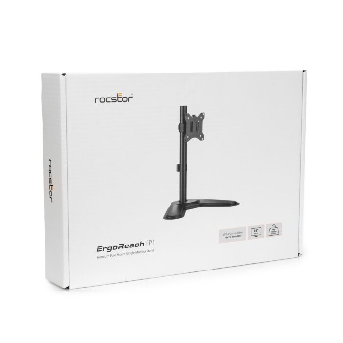 Rocstor ErgoReach EP1 Premium Single Monitor Stand – your ultimate solution for a stylish and organized workspace. Designed with functionality and durability in mind, this heavy-duty pole mount free-standing single monitor mount is the perfect companion for displays up to 34 inches. With a weight capacity of 9kg (19.8lbs) per monitor and compatibility with VESA 75x75mm and 100x100mm, it’s a versatile choice for a range of monitors from 17 to 34 inches. The ErgoReach EP1 features a quick-release VESA plate and height adjustment, allowing for swift setup and personalized positioning, reducing eye strain and neck pain while boosting productivity. Its ergonomic tilt range of ±45° and swivel range of ±90° offer unparalleled comfort and flexibility. Keep your workspace tidy and organized with integrated cable clip management, enhancing the overall aesthetics of your setup. Embrace an agile and efficient workspace with the Rocstor ErgoReach EP1 Premium Single Monitor Stand.