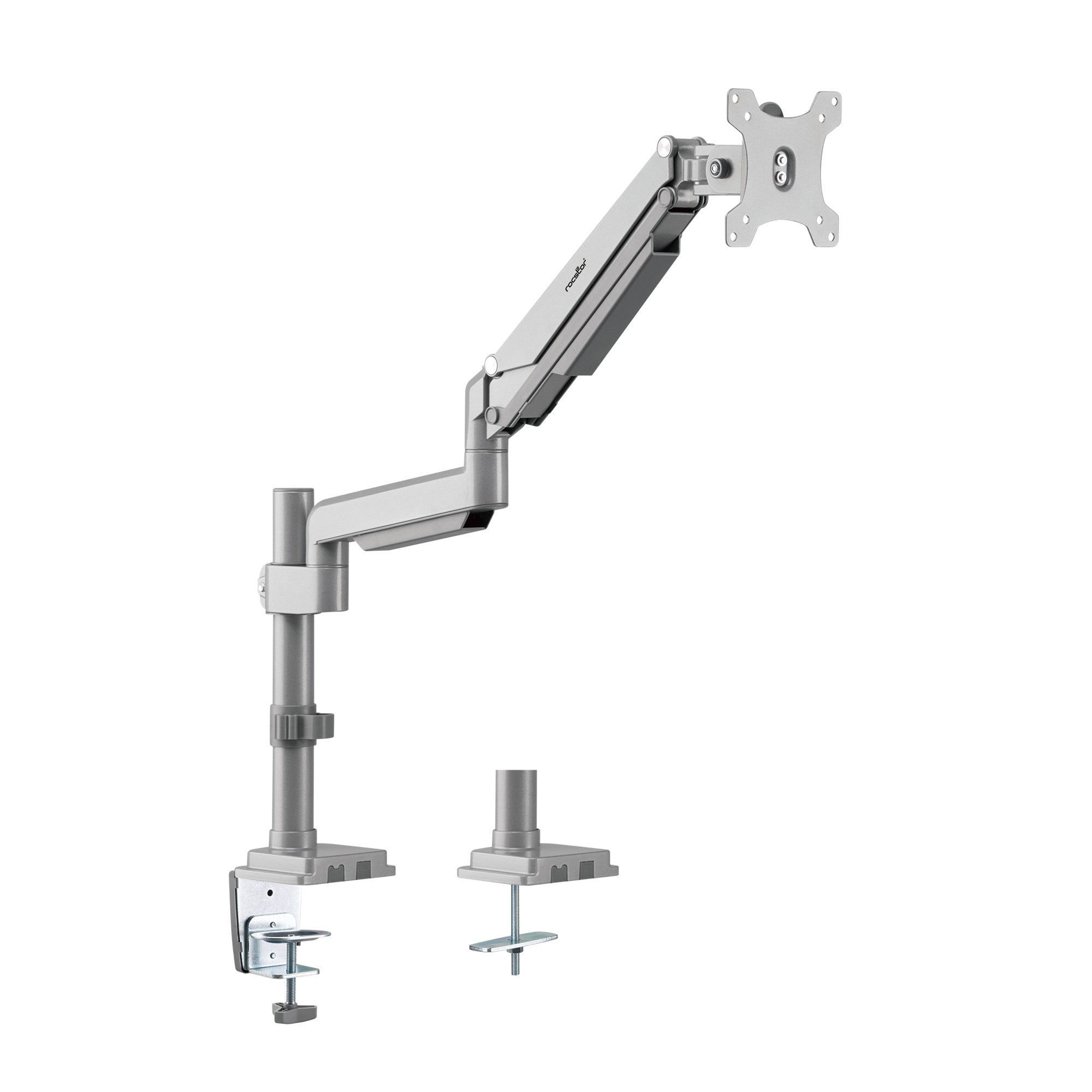 ErgoReach® EP15 Premium Aluminum Single Ergonomic Monitor Pole Mounted Arm, C-Clamp & Grommet – Premium Gas Spring – Supports up to 34″ Display, 19.8 lb – VESA 75×75 & 100x100mm – Ergonomic Tilt/Swive- – Portrait and Landscape – Aluminum Silver Grey