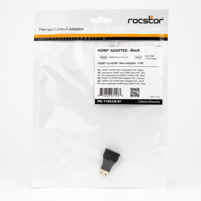 HDMI to Mini HDMI Adapter – F/M. Rocstor Premium allows you to connect a mini HDMI®-capable camera to a High Definition TV or Monitor using a standard High-Speed HDMI Cable.The HDMI Female to Mini HDMI Male adapter will change a Mini HDMI port to a standard HDMI port. You will have the ability to connect a Mini HDMI enabled device such as a digital camera, tablet or PC to a standard HDMI enabled device such as a projector, monitor or HDTV. Backed by Rocstor Lifetime Warranty.