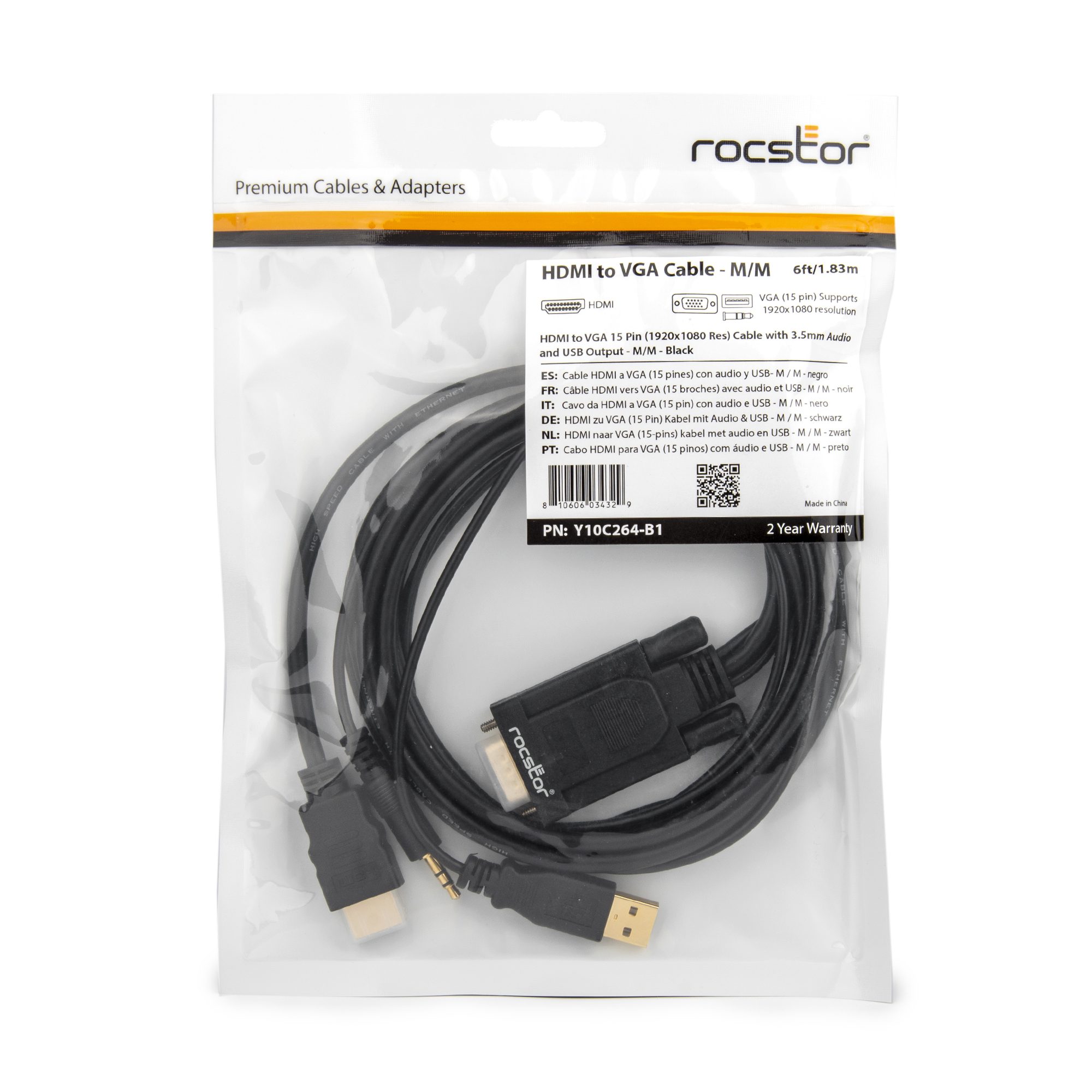 | Marketing Information | Rocstor's Premium 6ft HDMI® to VGA converter cable lets you connect your HDMI equipped Desktop, Laptop, or Chromebook™ to a VGA monitor or Projector. You will have all the connections needed with no additional adapters or cables required. You will enjoy complete connections for enabling sound to your VGA Display to Projector. This cable includes a USB port for power and an Audio connector to transfer a solid and uninterrupted sound to your VGA display. Unlike most HDMI to VGA adapters that require a power outlet to convert the video signal, this Rocstor premium cable does not require or need any additional external power in most installations. The integrated USB can be used for Power Delivery. The HDMI-VGA adapter is compatible with computer, PC desktop, Laptop, Ultrabook, Notebook, Chromebook®, Roku®, PS3®, Xbox® One, Xbox® 360, Wii® U, Set Top Box, TV BOX, or other devices with HDMI port; It also compatible devices with low-power HDMI ports such as SONY PS4, Apple MacBook Pro® with Retina Display, Mac mini®, and Apple TV®. Backed by Rocstor's 3-year limited warranty and free lifetime technical support. |