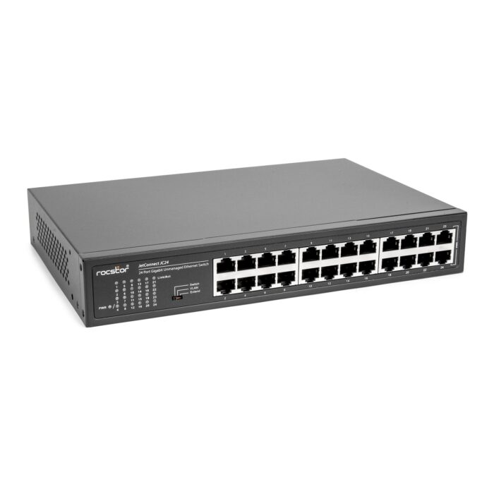 JetConnect JC24 24-Port Gigabit Desktop / Rackmount Unmanaged Ethernet Switch, 24x 10/100/1000 Adaptive RJ-45 Ports, 2 Layer Supported, Metal, Conforms to IEEE 802.3 / 802.3u / 802.3ab Standards – UL Certified – Rack mount – TAA Compliant – Black