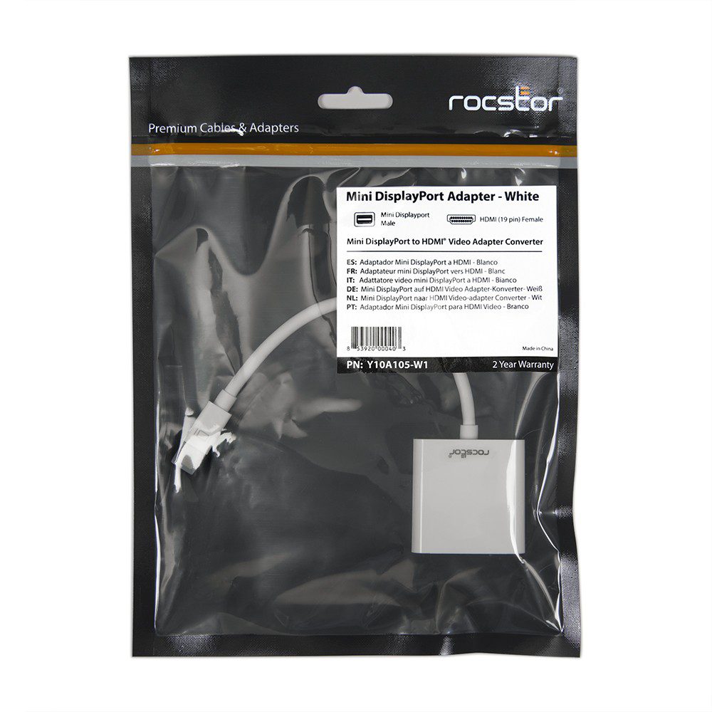 Mini DisplayPort to HDMI Video Adapter – White, The Rocstor premium Mini DisplayPort to HDMI lets you view video content from any MacBook, MacBook Air, MacBook Pro, Mac mini or an Ultrabook desktop or laptop with Mini DisplayPort video output on a variety of HDMI-compliant displays. This Mini DisplayPort to HDMI Adapter supports resolution of up to 1080p to provide crisp, rich video. Compliant with DisplayPort specifications version 1.1a and supporting a maximum video resolution of 1080p, this versatile adapter ensures a quality viewing experience on everything from monitors to projectors. . Purchase with confidence and rely on the protection of a 2 Year Limited Hardware Warranty from Rocstor for your Rocstor mini DisplayPort to HDMI adapter.