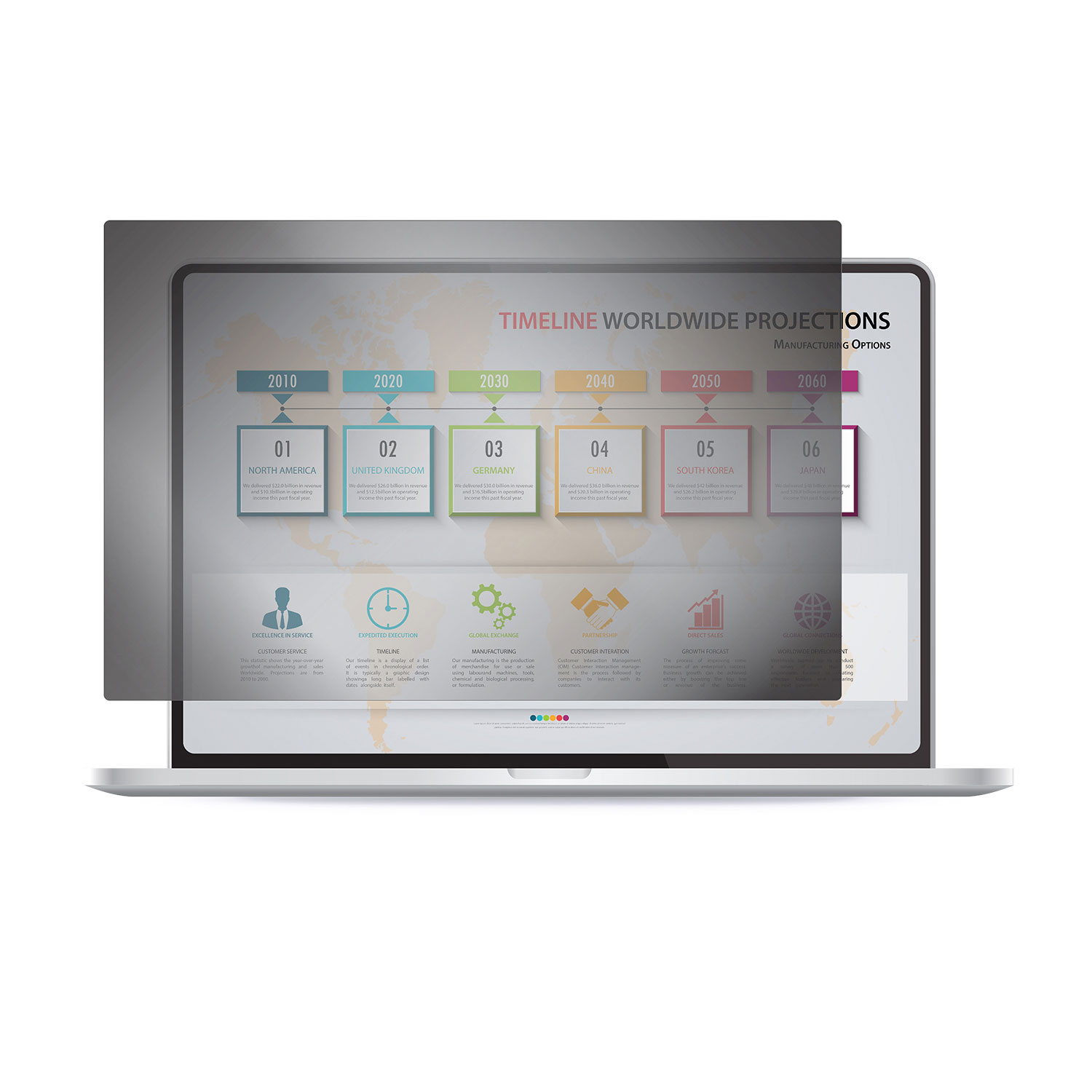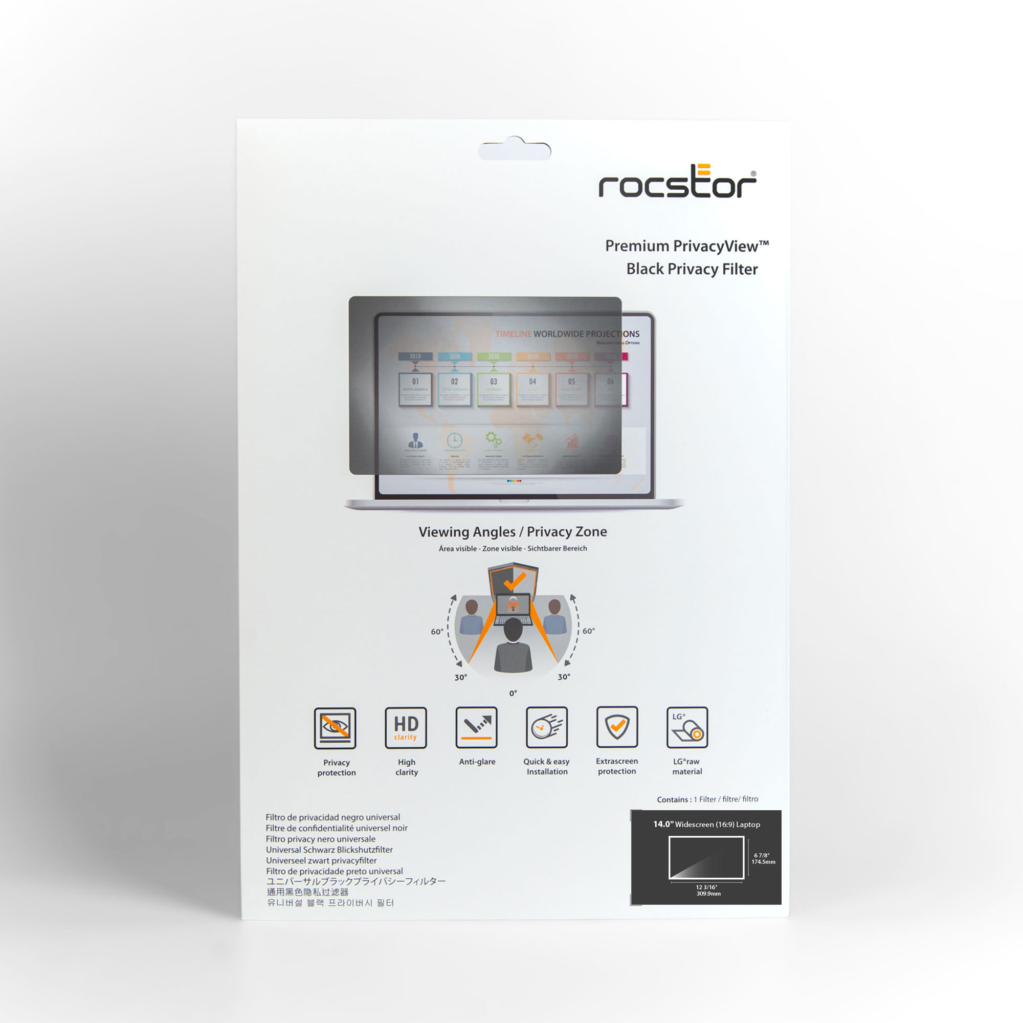 The Rocstor PrivacyView™ premium privacy and protection unframed filters provide a whole new level of security and privacy for your laptop. Rocstor 14' Widescreen filter, 16:9 aspect ratio privacy screen delivers the most advanced Microlouver Privacy Technology. Rocstor privacy filters can be used either in Glossy or Matte sides. The PrivacyView™ filters also protect from visual hackers and at the same time provides an amazing clear image for your direct view. Rocstor's advanced Privacy technology protects your information with tiny vertical blinds that are built on the surface of the filter which narrows the viewing angle. The information on your display would be only visible directly in front of the display up to 30 degrees away from the center of the screen and the sides are blacked out from outside of 60-degree viewing angle. Rocstor filters reduce display blue light by 37%.