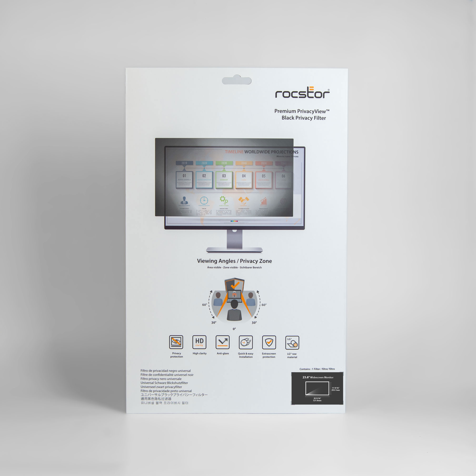 The Rocstor PrivacyView™ premium privacy and protection unframed filters provide a whole new level of security and privacy for your monitor. Rocstor 23.5' &23.6' filter 16:9 aspect ratio privacy screen delivers the most advanced Microlouver Privacy Technology. Rocstor privacy filters can be used either in Glossy or Matte sides. The PrivacyView™ filters also protect from visual hackers and at the same time provides an amazing clear image for your direct view. Rocstor's advanced Privacy technology protects your information with tiny vertical blinds that are built on the surface of the filter which narrows the viewing angle. The information on your display would be only visible directly in front of the display up to 30 degrees away from the center of the screen and the sides are blacked out from outside of 60-degree viewing angle. Use Rocstor's PrivacyView™ screen filters to support compliance with privacy regulations such as Health Insurance Portability Accountability ACT (HIPAA) and Health Information Technology for Economics and Clinical Health (HITECH). Rocstor's privacy screen filters are the means for protecting private and personal corporate, legal and medical records. Use your PrivacyView™ filters with confidence backed by exceptional Rocstor's Two-year limited warranty.