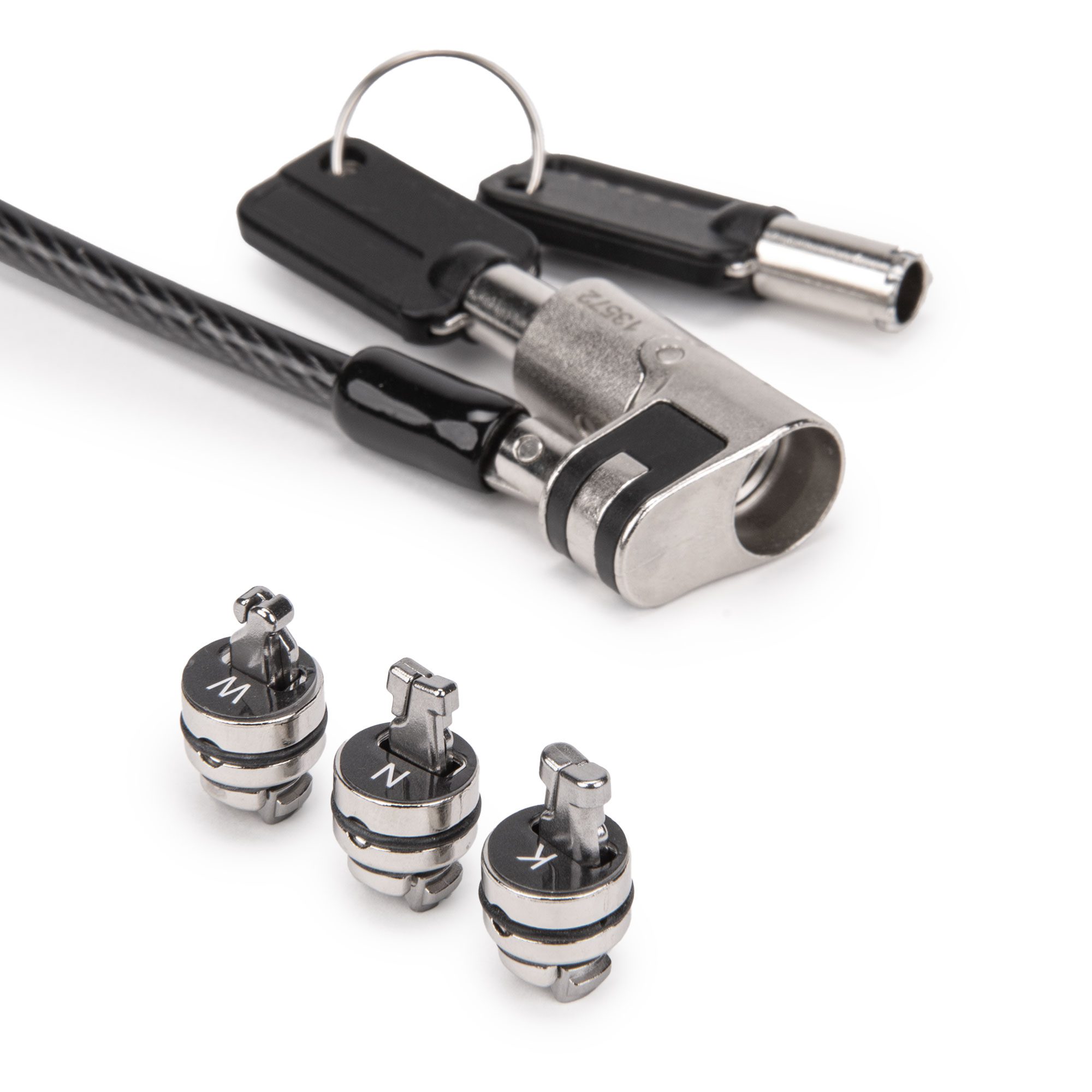 The Rocbolt Universal 3-IN-1 Keyed Security Laptop Lock simplifies your security management with a single keying system. The smaller key opening is designed to thwart picking attempts, providing peace of mind. The anti-pick technology resists tampering, making this lock a reliable choice for safeguarding your devices. The lock includes two keys for added convenience and backup security.