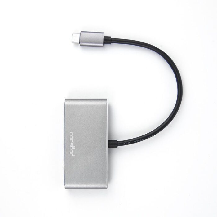 The Rocstor 4-Port hub has a stylish Aluminum charcoal grey enclosure and it turns a USB Type-C port on your laptop into three USB Type-A ports (5Gbps) and one USB Type-C port. The 4-port USB 3.0 hub lets you connect both USB-C™ and USB-A peripherals to your laptop or Chromebook™, through a single USB Type-C™ or Thunderbolt™ 3 port. Rocstor puts design first and provides a small, compact and lightweight 4-Port Mini Hub that can slip into your laptop bag or your business briefcase. It is USB-powered hub and it is tailored for portability. At a Glance: