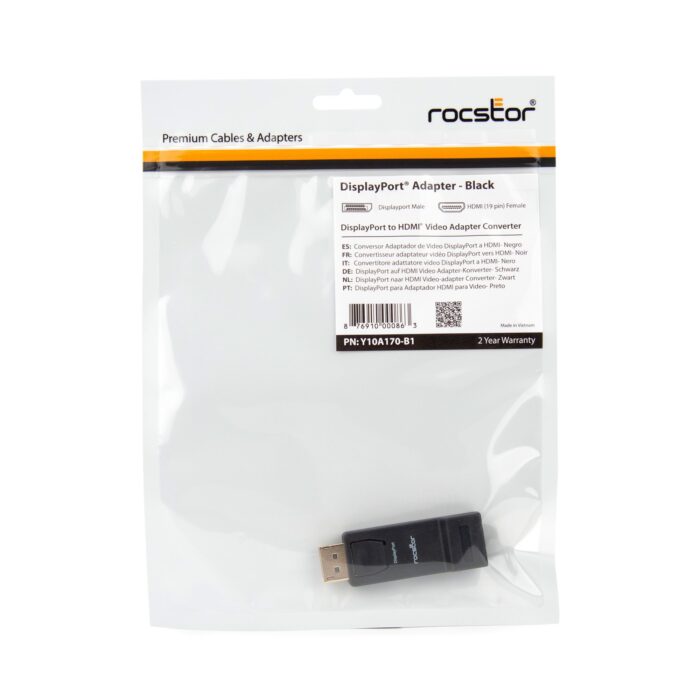 DisplayPort™ to HDMI® Video Adapter Converter – M/F, Rocstor Premium adapter enables you to connect a HDMI® monitor to a computer or notebook DisplayPort®. The DisplayPort to HDMI® Adapter is compliant with the DisplayPort standard and has a bandwidth of 2.25 Gbps to support crystal clear 1920 x 1200 at 60 Hz 1080p HDTV display resolution – making it ideal for using any monitor with HDMI interface as a secondary display. This Rocstor adapter provides a DisplayPort male and HDMI female connector, it enables you to keep your existing (HDMI) display while using a DisplayPort video port source. Use your Rocstor premium adapter Worry free which is backed by 2 Year Limited Warranty.