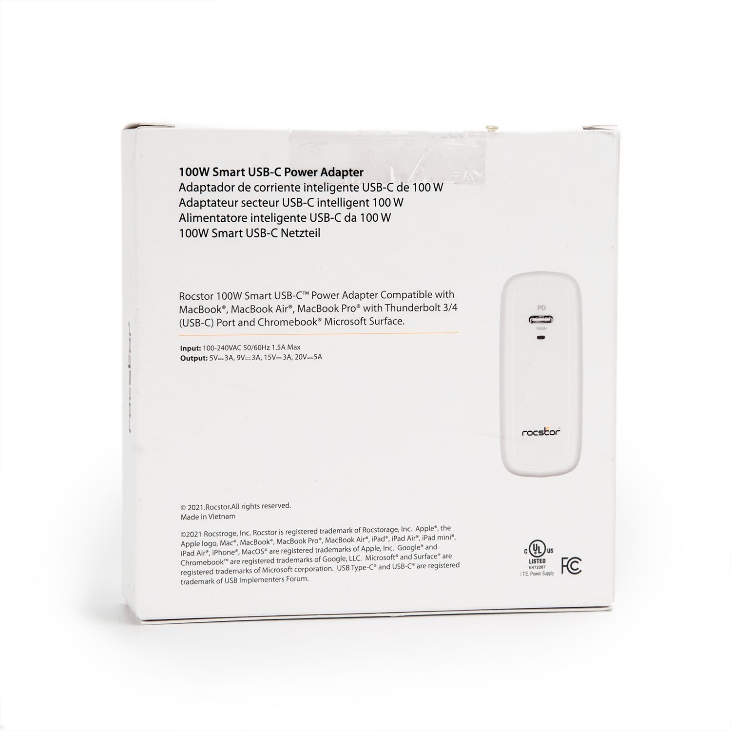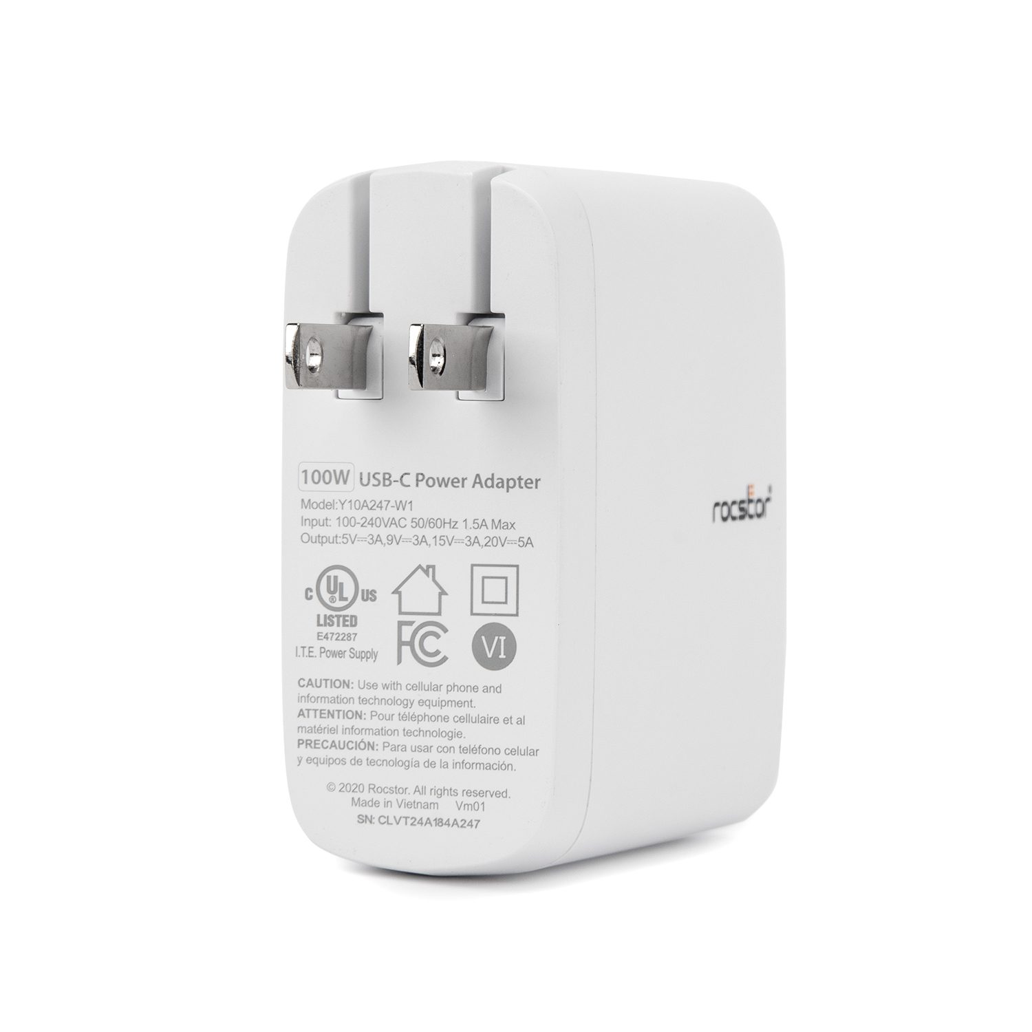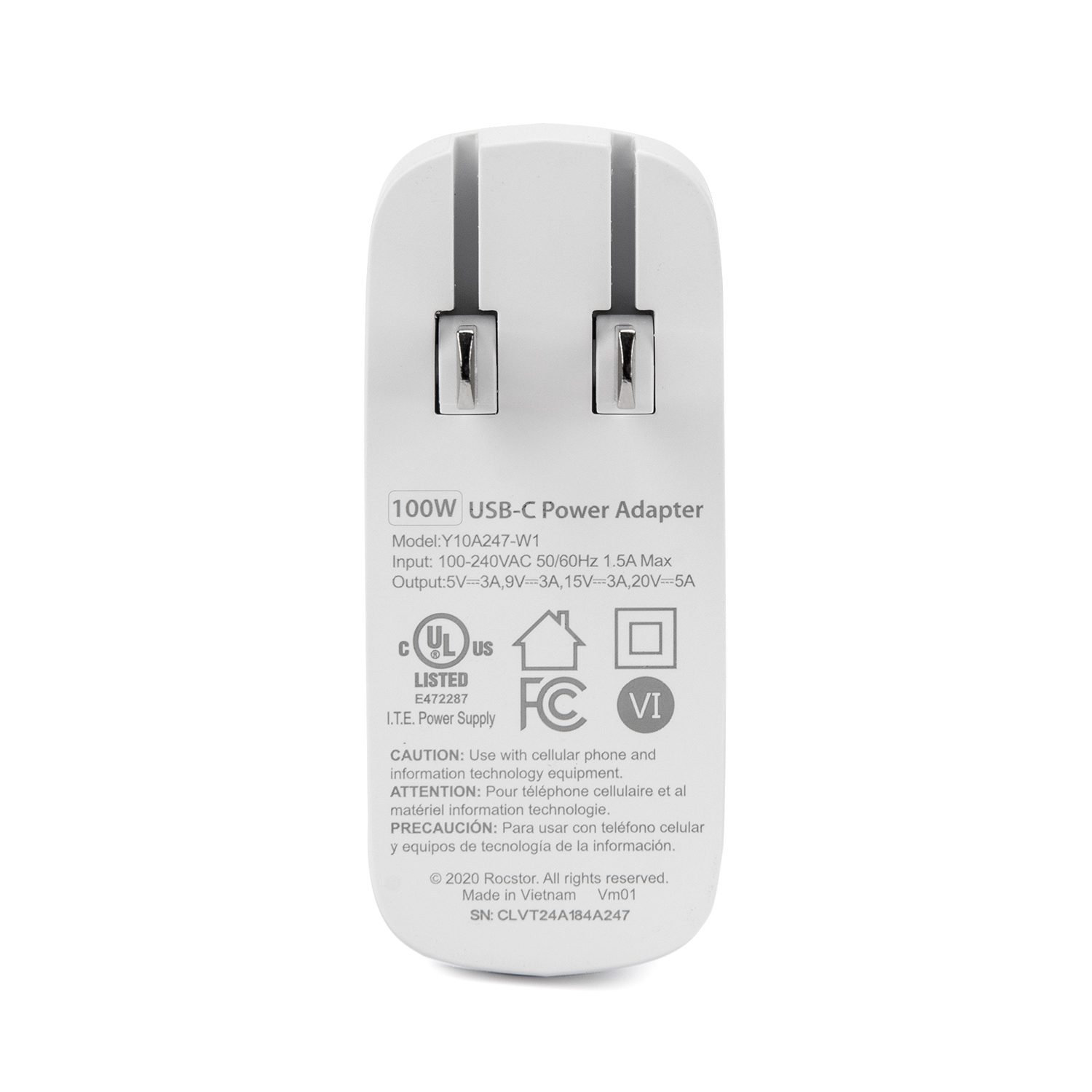 | Marketing Information | Rocstor 100W Smart USB-C Power Adapter offers charging compatibility with numerous USB-C devices such as Apple® MacBook Air® 13', MacBook Pro® 13' (61W), MacBook Pro® 14' (67W), MacBook Pro® 15.6' (87W), MacBook Pro® 16' (96W) charging power requirement. This versatile smart power adapter can charge any HP®, Lenovo®, Dell and Chromebook™ devices that utilize up to 100W power. Rocstor's 100W Smart power adapter automatically adjusts to your device power requirement up to 100W. This travel and compact charger is rugged, light and it is able to charge laptops, iPad®, tablets, cellular phone, earphones and everything else with a USB power input up to 100W. You can take advantage of this fast power adapter to charge your Apple® iPhone®, Samsung Galaxy®, or Google® Pixel® phone and tablets. The slim and compact design charger measures only 2.75' x 2.66' x 1.17' (70 x 67.6 x 29.5 mm) and features a foldable plug. The Rocstor 100W has the latest GaN (Gallium Nitride) Charging Technology and it holds the UL, FCC/CE certifications for the máximum safety protocols. It has a more efficient current transfer, which translates to less power loss to heat. Backed by Rocstor's 1-year warranty and lifetime technical phone support.