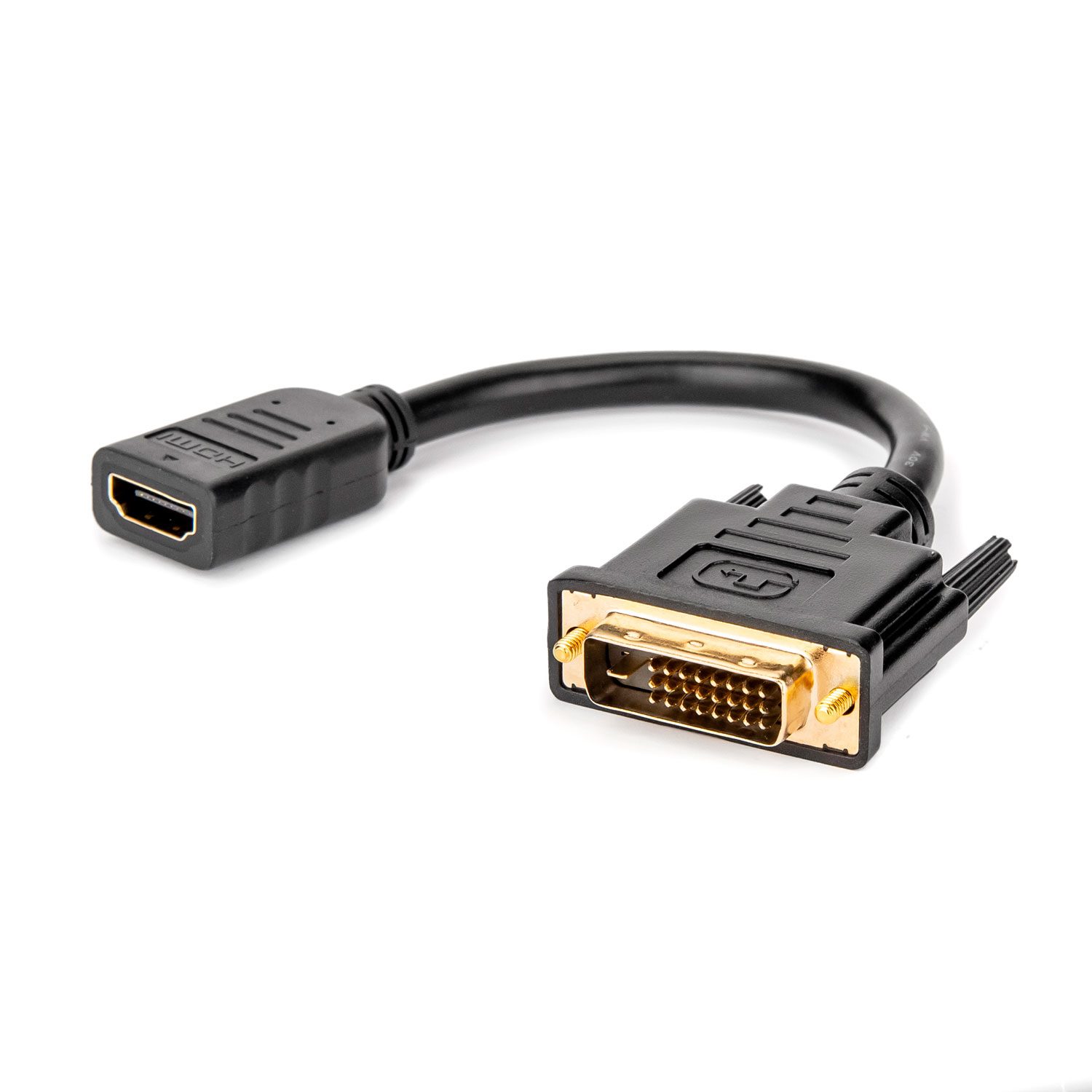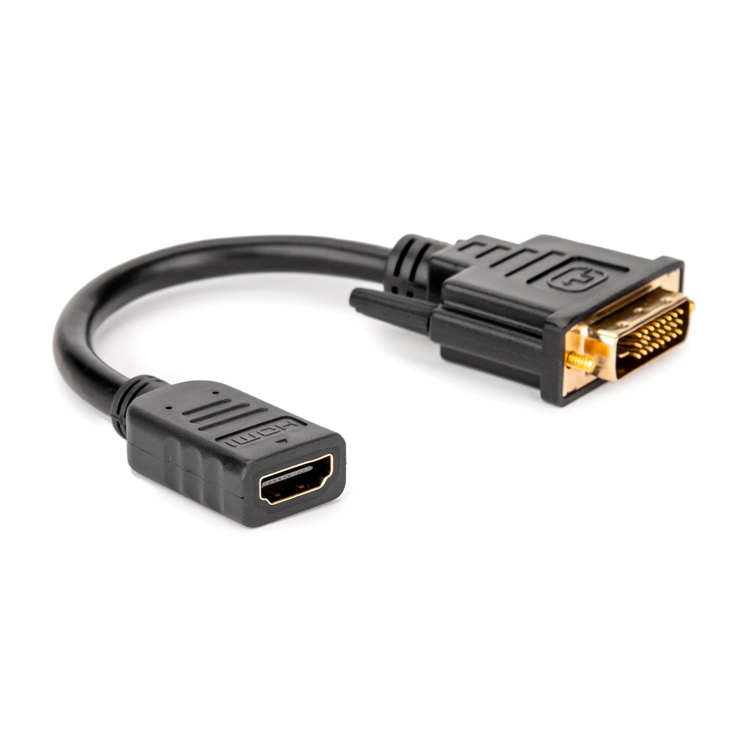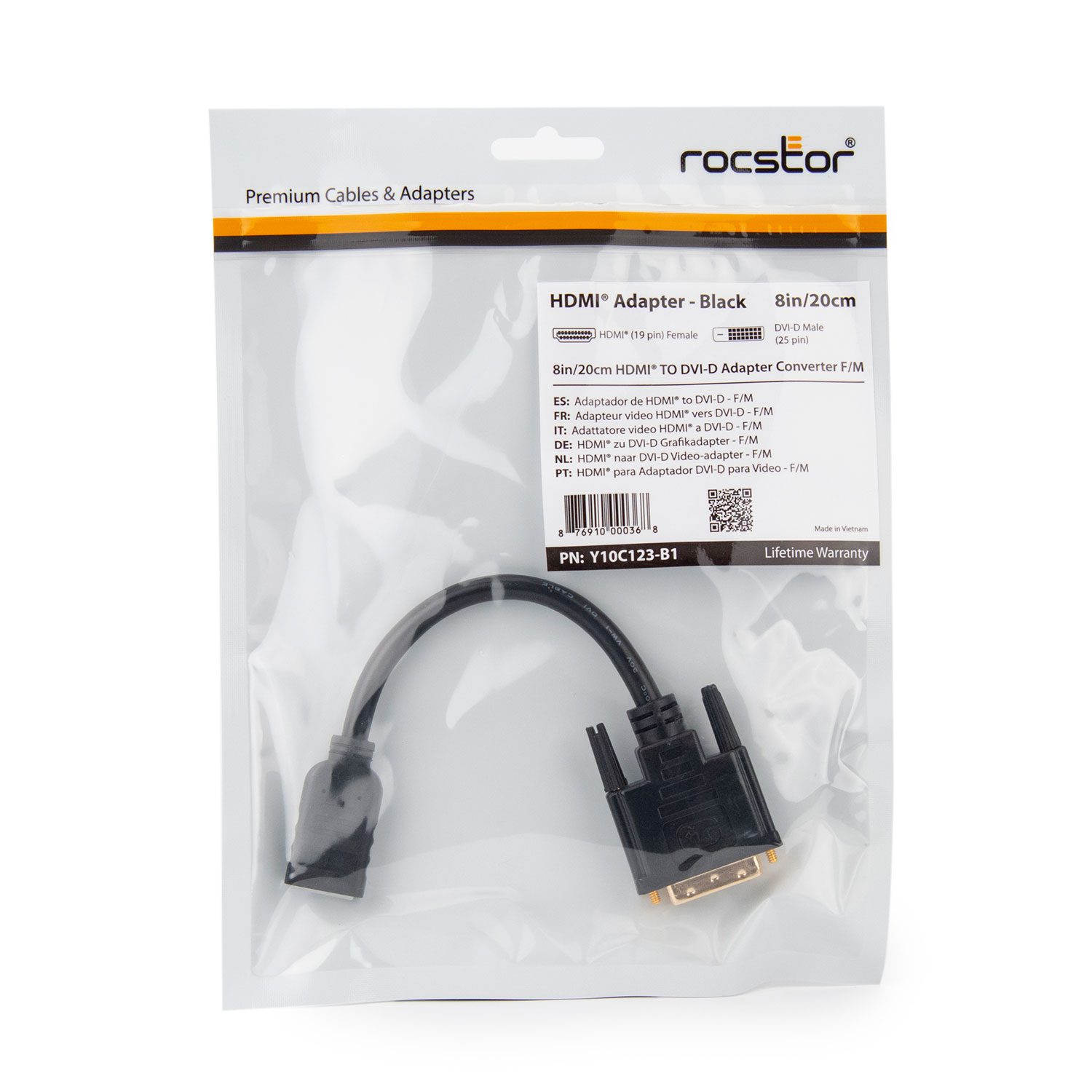 HDMI to DVI-D Video Cable Adapter – 8 inch. The Rocstor Premier 8 DVI-D to an HDMI adapter enables you to connect your HDMI device using a standard HDMI cable to a DVI-D device. Rocstor Premium adapters are built strong and feature a compact 8in design which features HDMI to DVI-D Video Adapter Cable. You will find one HDMI female connector at one end and one DVI-D male connector at the other. Providing a bi-directional connection between HDMI-capable and DVI-D capable devices for a full compatibility between your devices. The HDMI to DVI adapter offers a DVI_D Dual-Lin (24+1) adapter and 8-inches in cable length. This provides less stress on the connectors and prevents possible distraction and address conflict to the cable and connectors.