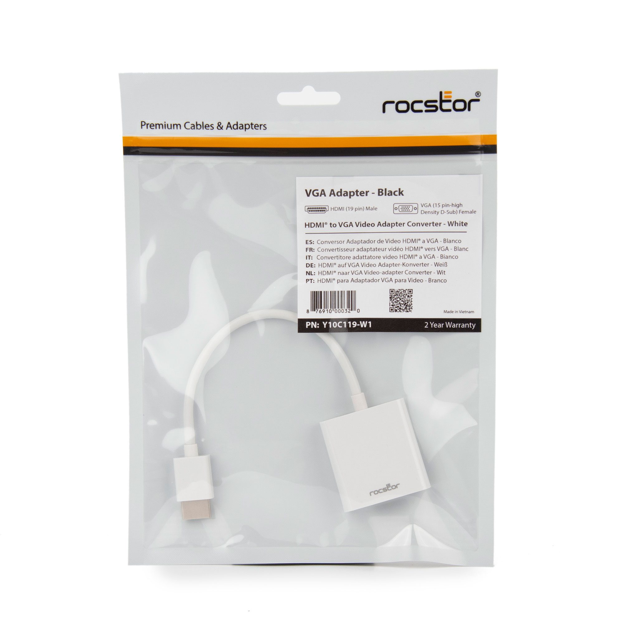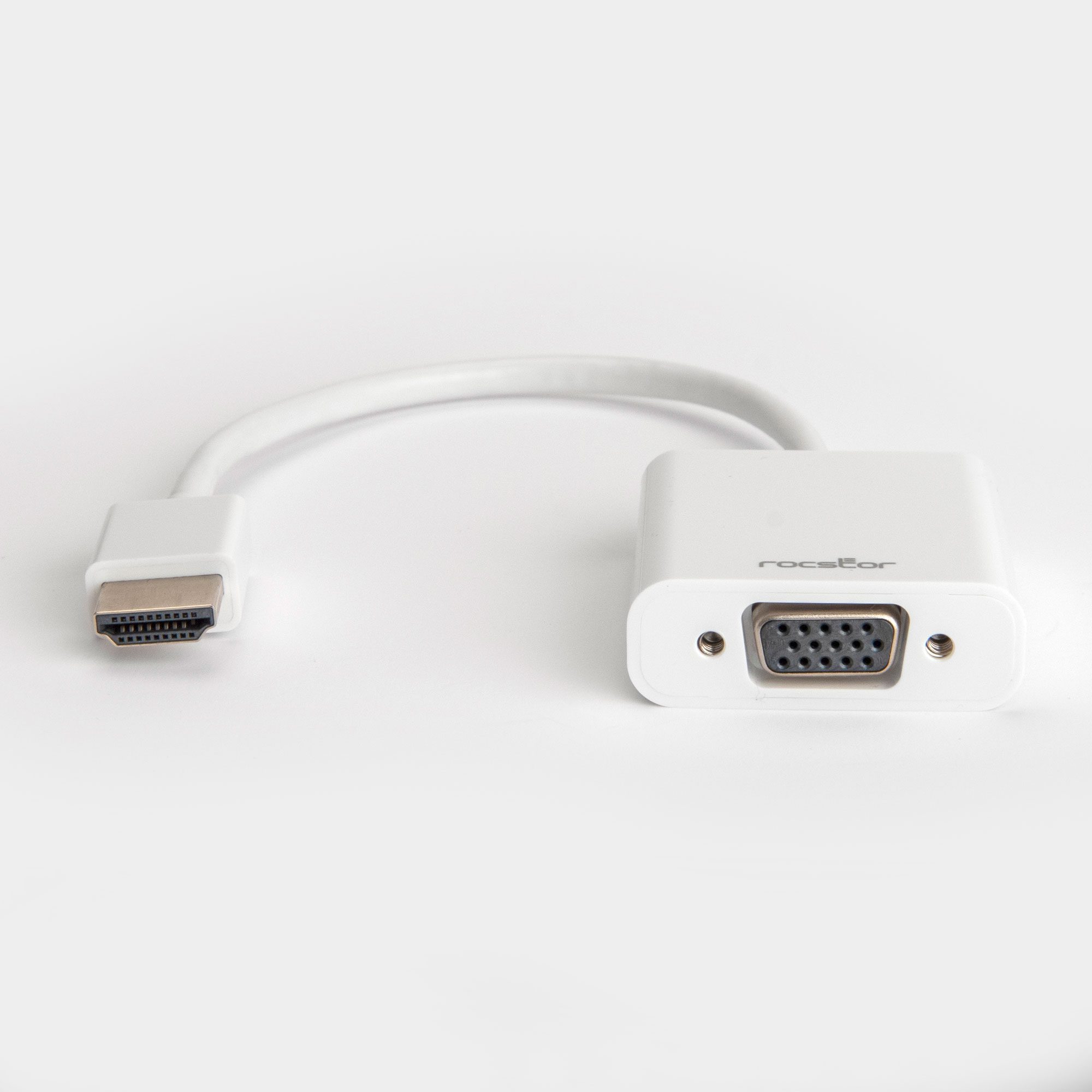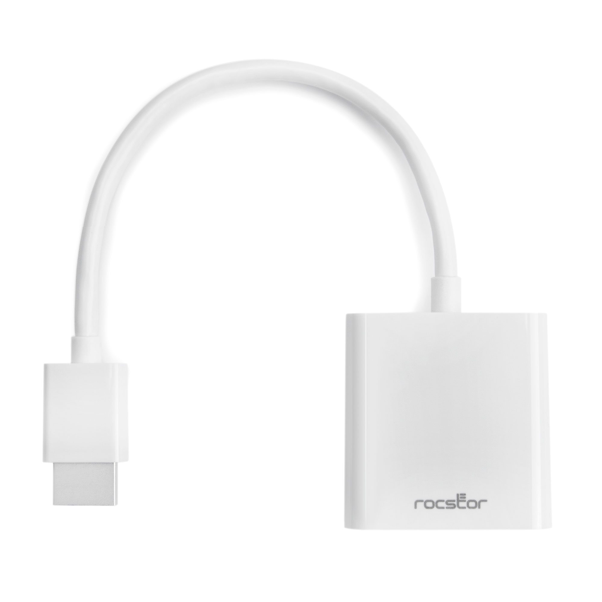 HDMI to VGA Adapter Converter M/F – White. The Rocstor Premium HDMI to VGA adapter enables you take video content from your laptop, tablet, or Desktop PC and display it on any monitor, projector or HDTV featuring a VGA input. With no need for an external power source, and support for resolutions up to 1080p (1920×1080), this active HDMI to VGA adapter offers a compact and portable solution for connecting a High-Definition VGA display. Rocstor Premium cables are built strong and feature a compact design. Measuring 6 x 1.6 x 0.64 (L x W x H) inch, this plug-and-play white adapter is easy to use and extremely useful for presentations for clients or movie nights with friends. It also allows you to enjoy your display content or movies on a home projector, mirror your desktop for an expanded show presentation at work, home, or school.