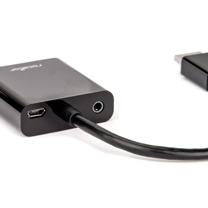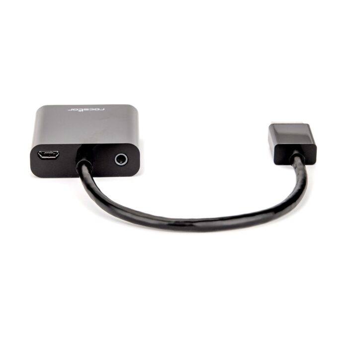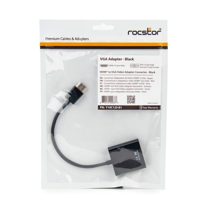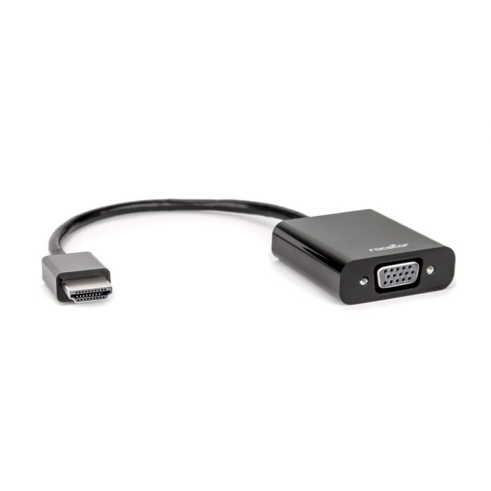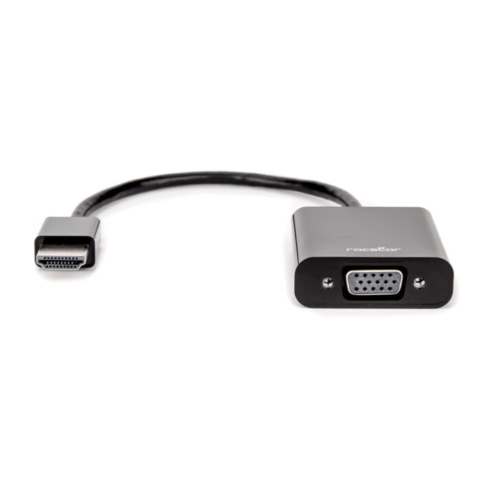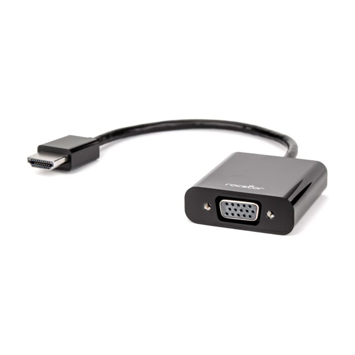 HDMI to VGA Adapter Converter M/F – Black. The Rocstor Premium HDMI to VGA adapter enables you take video content from your laptop, tablet, or Desktop PC and display it on any monitor, projector or HDTV featuring a VGA input. With no need for an external power source, and support for resolutions up to 1080p (1920×1080), this active HDMI to VGA adapter offers a compact and portable solution for connecting a High-Definition VGA display. Rocstor Premium cables are built strong and feature a compact design. This plug-and-play black adapter is easy to use and extremely useful for presentations for clients or movie nights with friends. It also allows you to enjoy your display content or movies on a home projector, mirror your desktop for an expanded show presentation at work, home, or school.