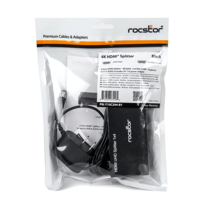 Marketing Information Rocstor Premium 4 Port HDMI® Splitter is a perfect accessory for users who would like to connect their HDMI display source to multiple HDMI displays simultaneously, as it provides 4 separate HDMI output ports, each having 4K ultra-high-definition resolution at 60Hz.