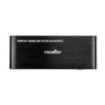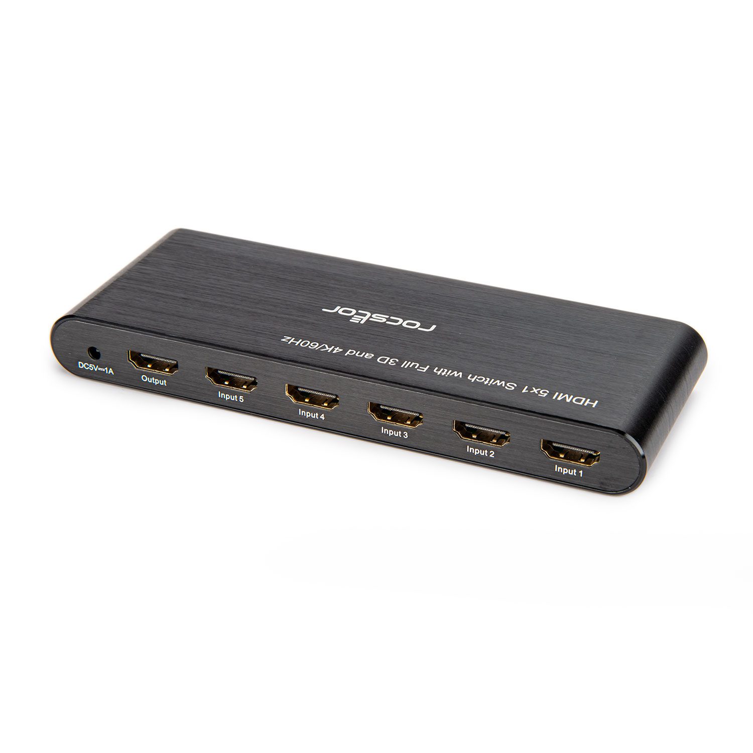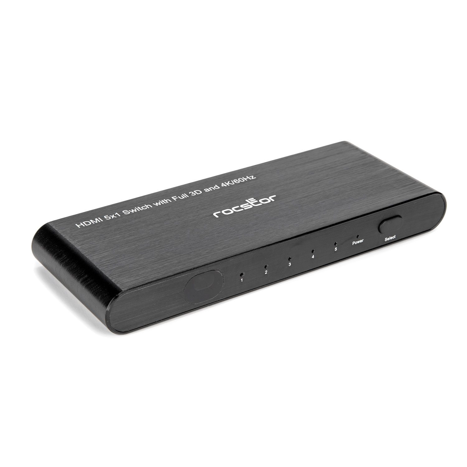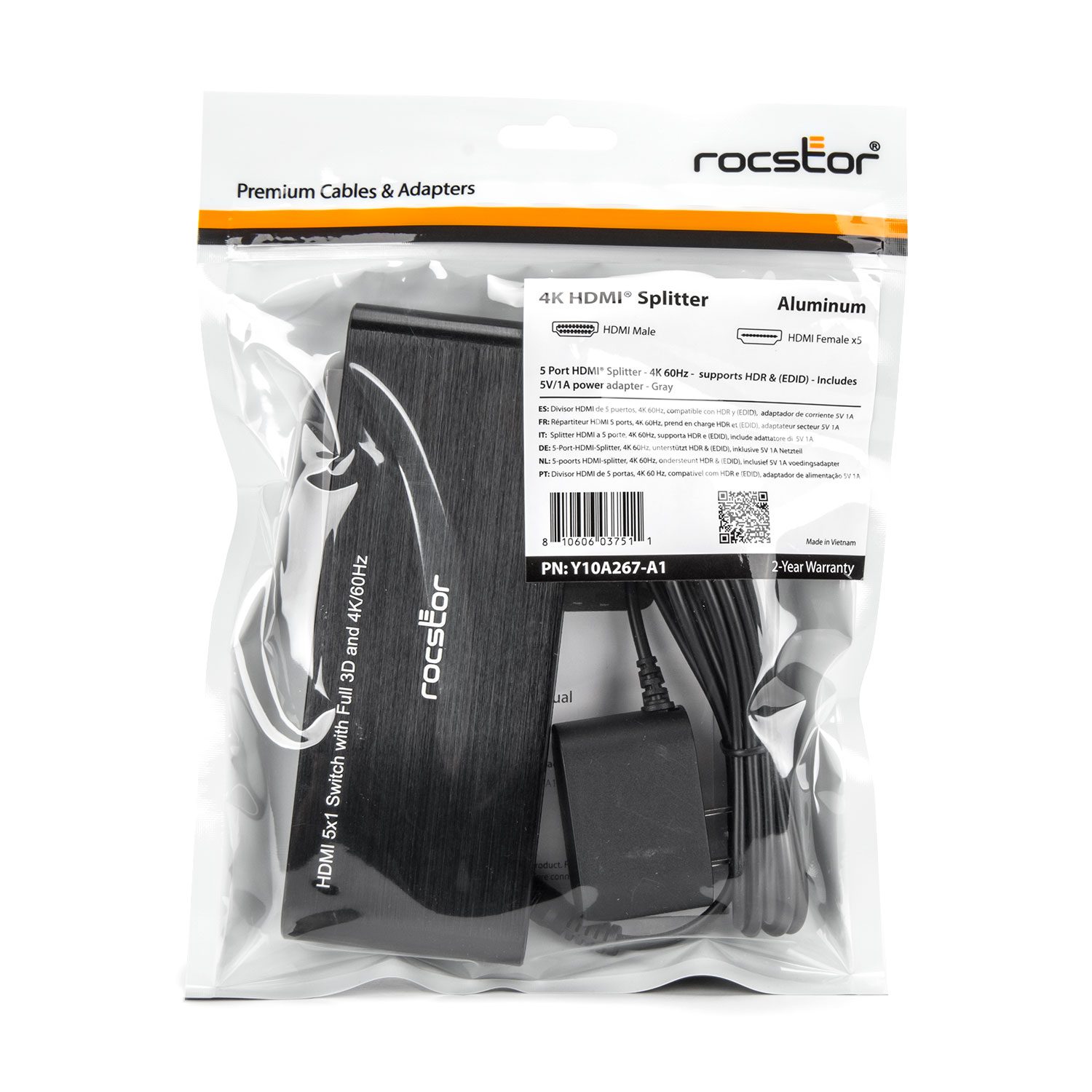 Rocstor Premium 5 Port HDMI® Splitter – 4K 60Hz – 5×1 Way HDMI 2.0 Splitter – Supports to switch 5 HDMI sources to 1 HDMI Display/TV/Projector – Integrated Extended Display Identification Data (EDID) technology – Includes 5V 1A power adapter – Aluminum Gray