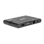 Marketing Information Portable USB-C® Multiport Adapter, 2x USB-C, USB-A, HDMI, VGA, RJ45, SD Card, modifies your laptop into a portable workstation by providing the convenience of multiple adapters integrated into a single connector. This mini power hub supports three USB 3.0 Type-A ports, 4K HDMI port, 1080p VGA port, SD and microSD card slots, and a Gigabit Ethernet port for network access. It is compatible with Dell™, HP®, Lenovo®, Surface®, Chromebook™, MacBook®, iPad Pro® and Samsung devices on Windows®, macOS®, ChromeOS®, iPadOS®, Android®.