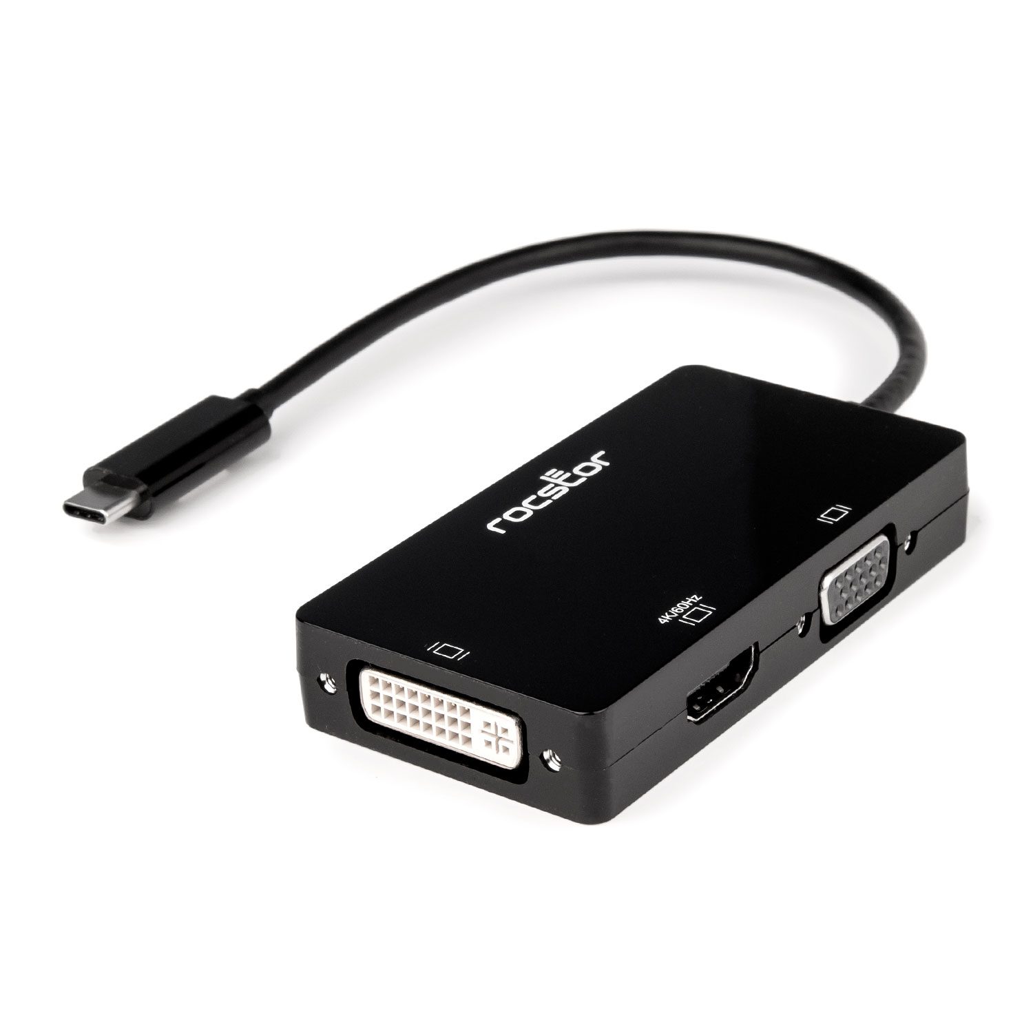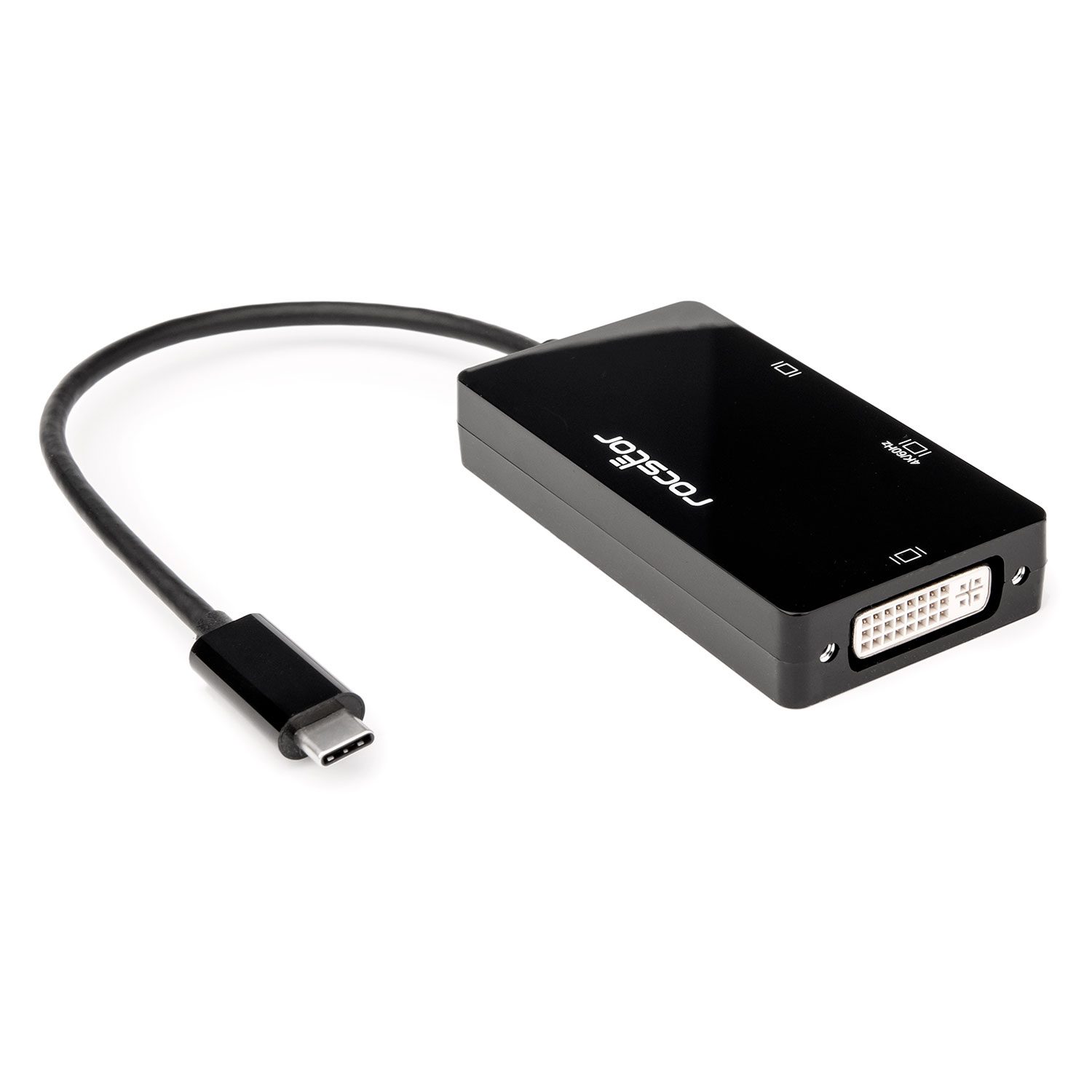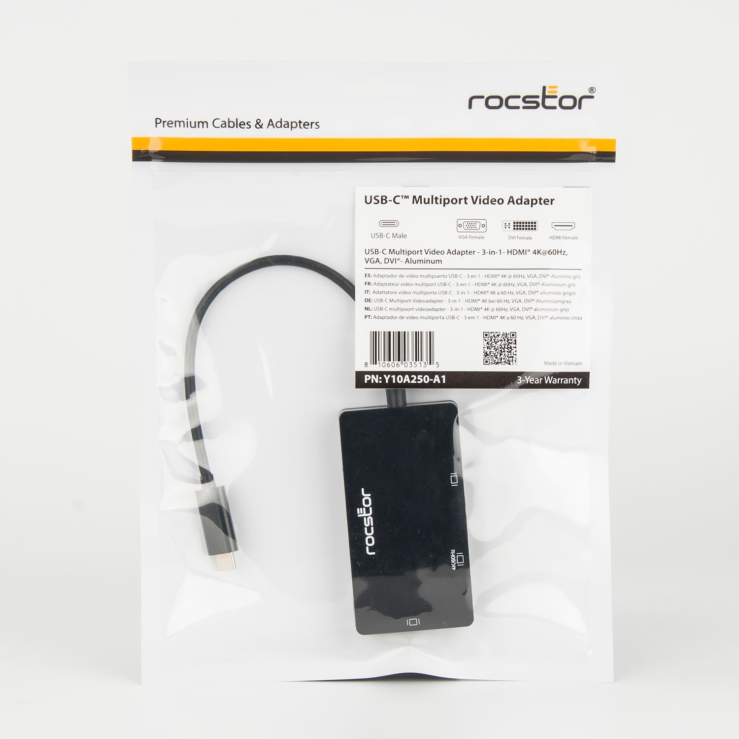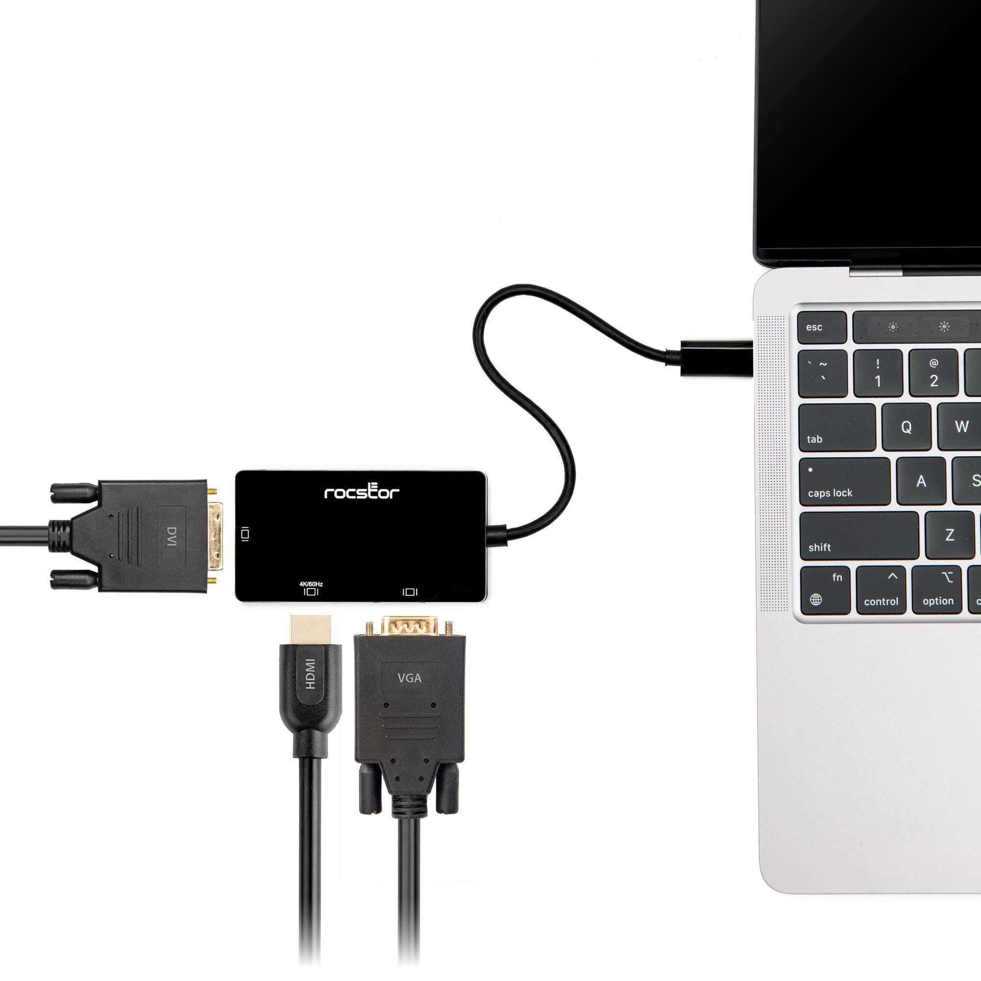 Rocstor Premium USB-C Multiport Video Adapter 3-in-1 – 1 x USB Type C Male – 1 x HDMI Digital Video Female, 1 x DVI Digital Video Female, 1 x 15-Pin HD-15 VGA Female – 3840 x 2160 Supported – Black