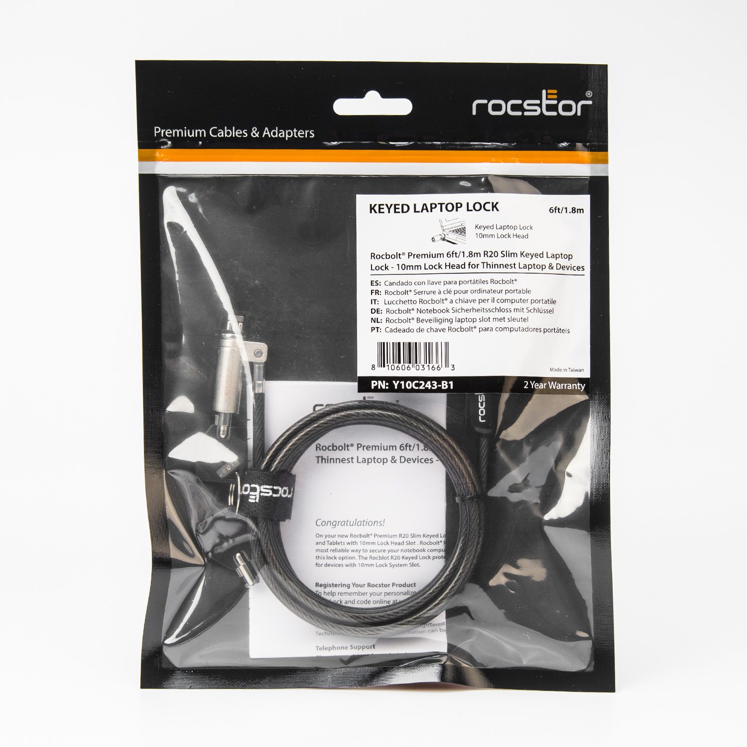 The Rocstor Rocbolt R20 Premium Slim Security Lock is engineered for thin and ultra-slim laptops, Ultrabooks, and other K-slot-compatible devices, offering exceptional protection in offices, schools, and public environments. Featuring a strong yet slim 10mm lock head, it provides a secure fit without compromising device design. The 6 ft (1.8m) galvanized heavy-duty steel cable, with a 5mm diameter, offers robust resistance against cutting and tampering, ensuring reliable security.