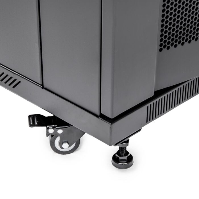 This enclosure cabinet is built with safety and security in mind. The locking, reversible front and rear doors, along with locking removable side panels, prevent unauthorized access while allowing easy inspections and maintenance. The top and bottom panels feature ports for efficient cable routing and vents for effective convection cooling. This design promotes the removal of warm air and the intake of cool air, and also supports the installation of standard case fans to enhance airflow. For ease of deployment, the R3003 comes with an accessory caster kit, enabling easy maneuverability into the desired location. Once positioned, the unit can be stabilized with its adjustable levelers. The enclosure ships fully assembled, ensuring a quick and hassle-free setup. Backed by Rocstor 5-year warranty and lifetime technical service.