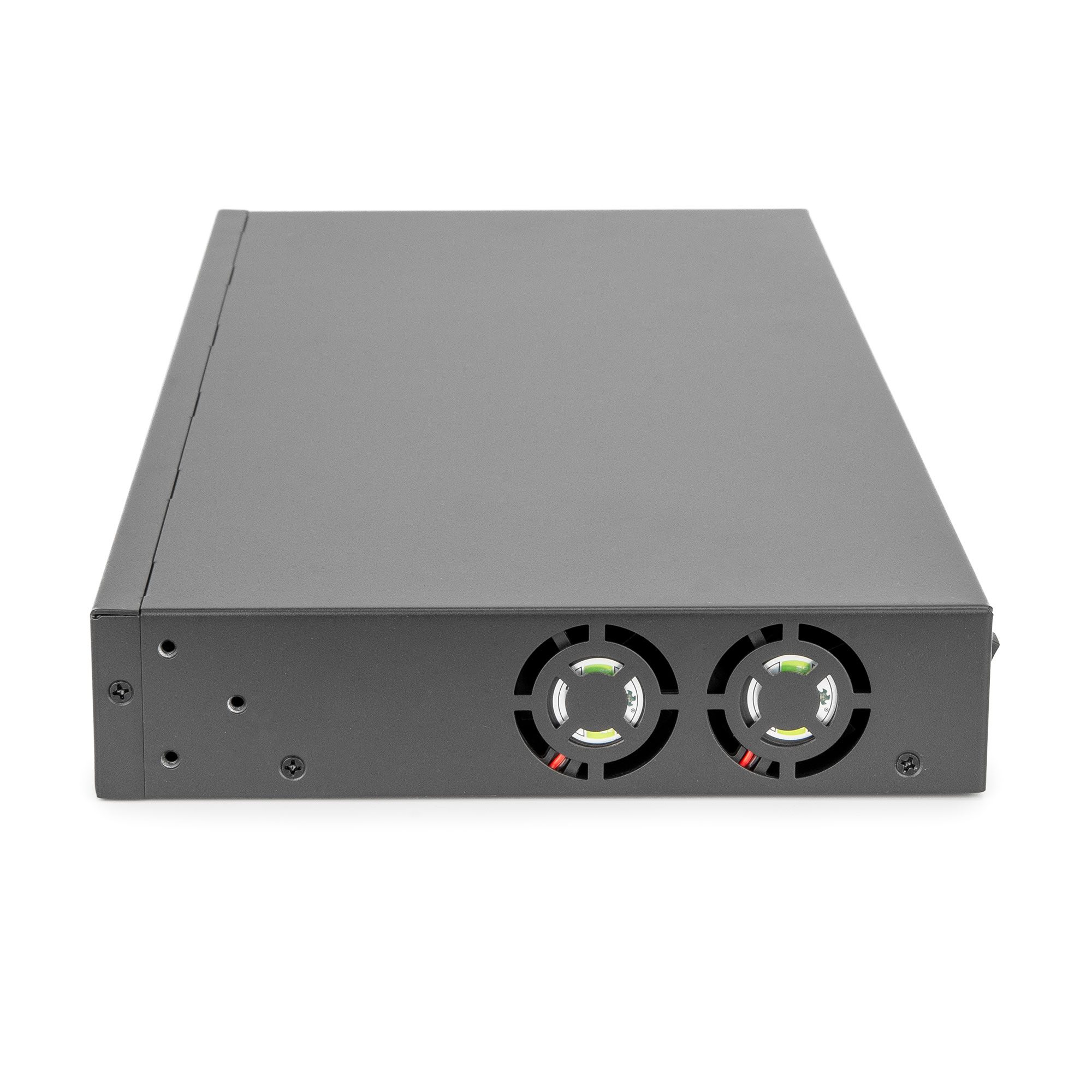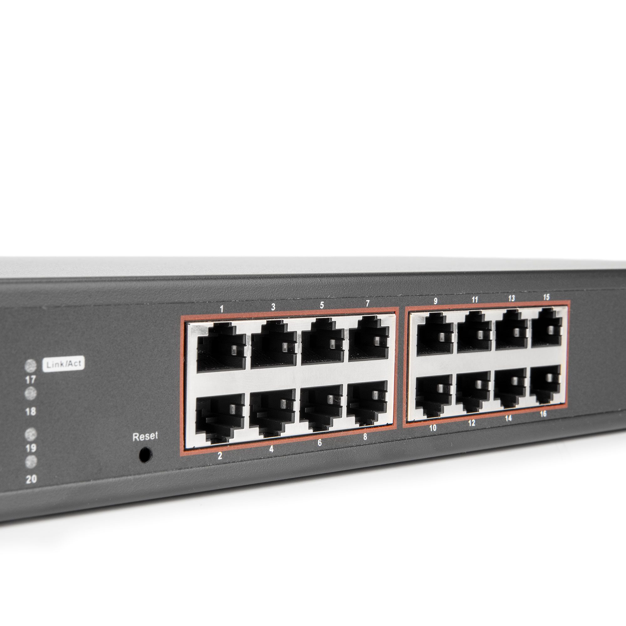 • Versatile Connectivity: Features 16 Gigabit PoE ports, (2) Gigabit RJ45, and (2) Gigabit SFP transceiver slots, offering flexible connection options.