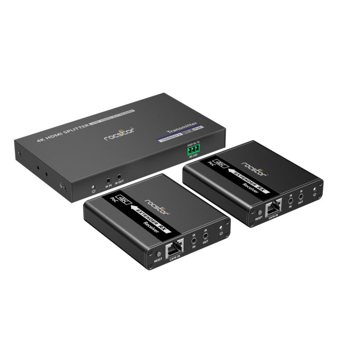 The Rocstor TrueReach TR14 Splitter with Power over Network Cable POC 4K/1080p 1 to 2 HDMI is an innovative solution designed to distribute one HDMI™ input signal into two identical outputs while extending these signals up to an impressive 230 feet (70m). This splitter extender kit supports 4K@30Hz resolution and ensures a visually lossless transmission with zero latency, making it perfect for a range of applications including outdoor advertising, studios, and multimedia classrooms. Enhanced with bi-directional IR passthrough and RS-232 control, this device offers seamless integration and flexibility. Additionally, the 3.5mm L/R audio output functionality enhances audio distribution, ensuring that your setup is as versatile as it is powerful.