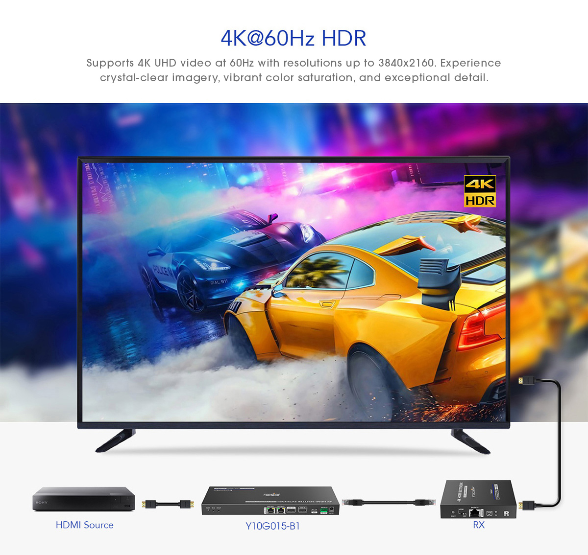 • Extended Reach: Extends 4K@60Hz HDMI signals up to 230 feet (70m) over CAT6/6A/7 network cables, ensuring zero latency and maintaining signal integrity.