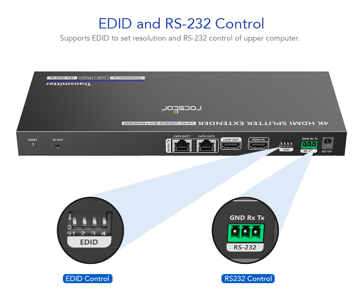 Equipped with advanced features like IR passback and RS-232 control, this device ensures flexible and efficient operation. The PoC (Power over Cable) technology simplifies installation by allowing the splitter to be powered through the network cable, eliminating the need for separate power supplies. With support for EDID, users can customize resolution settings to meet their specific needs, while the RS-232 control facilitates remote management. Whether you’re setting up a conference room, sharing content in a family environment, or enhancing a shopping mall display, the Rocstor TrueReach TR15 Splitter is built to deliver superior performance and reliability.
