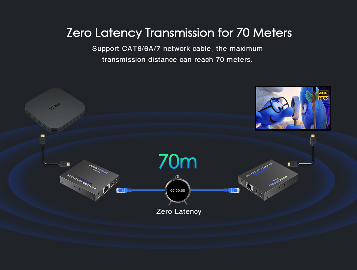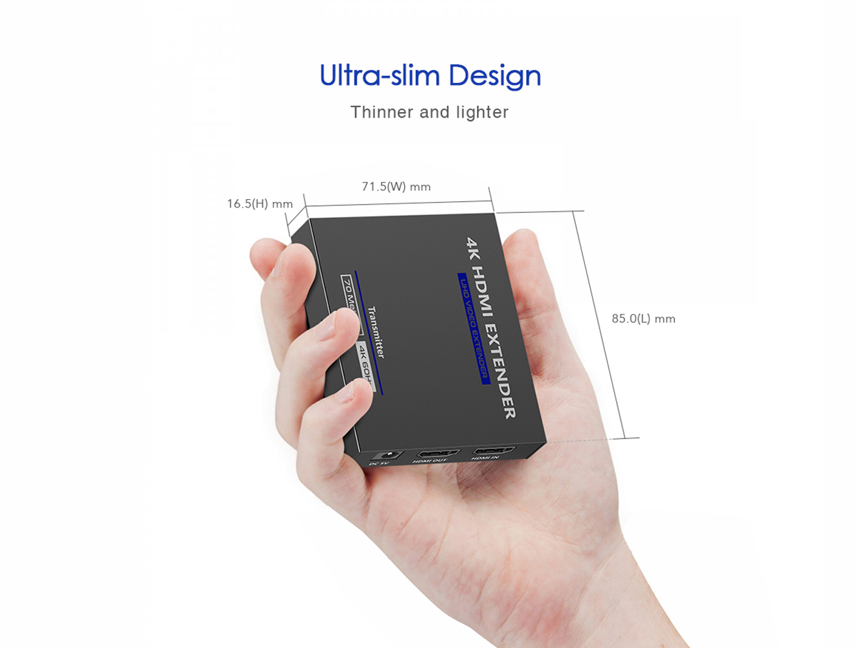 • Transmission distance of up to 131 ft (40 meters) for 4K @ 60Hz and 70 meters for 1080p @ 60Hz signals