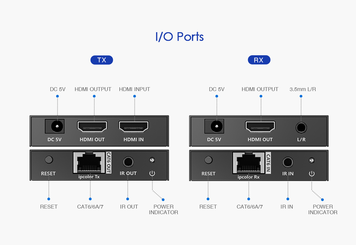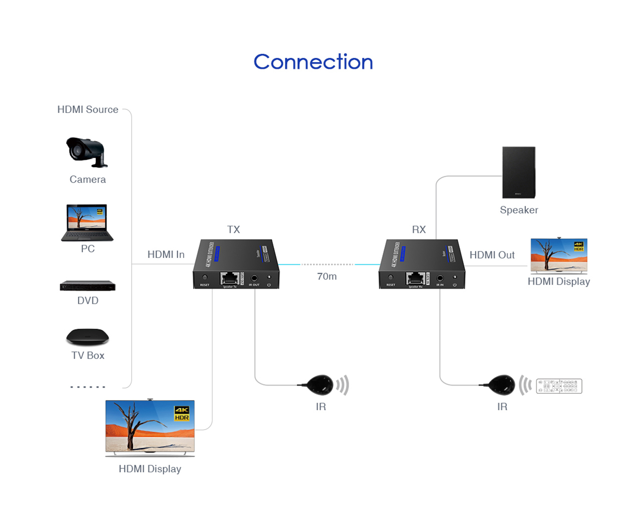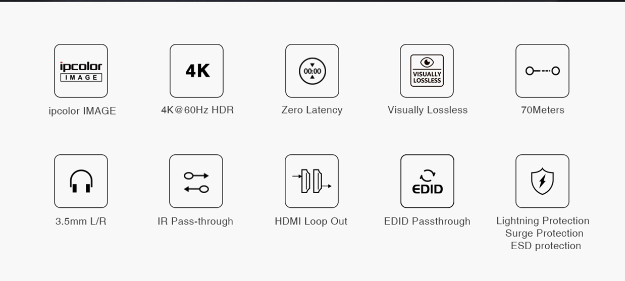 4K@60Hz HDMI Extender over CAT6/CAT6a/Cat7 Ethernet Cable – 4K 60Hz up to 230ft (70m) – Point to Point Extender – iPcolor Image – Zero Latency – 3.5mm Audio – Includes HDMI Transmitter and Receiver (Kit) – Supports IR pass-through – HDCP 2.2, EDID, HDR, YUV4:4:4 – HDMI 2.0 Extender over CAT6/CAT6a/Cat7 Ethernet – One UL power supply – No Software/drivers required – Metal housing Includes built-on mounting brackets – Black