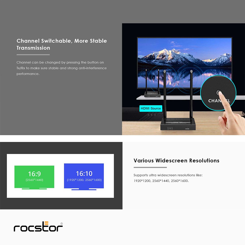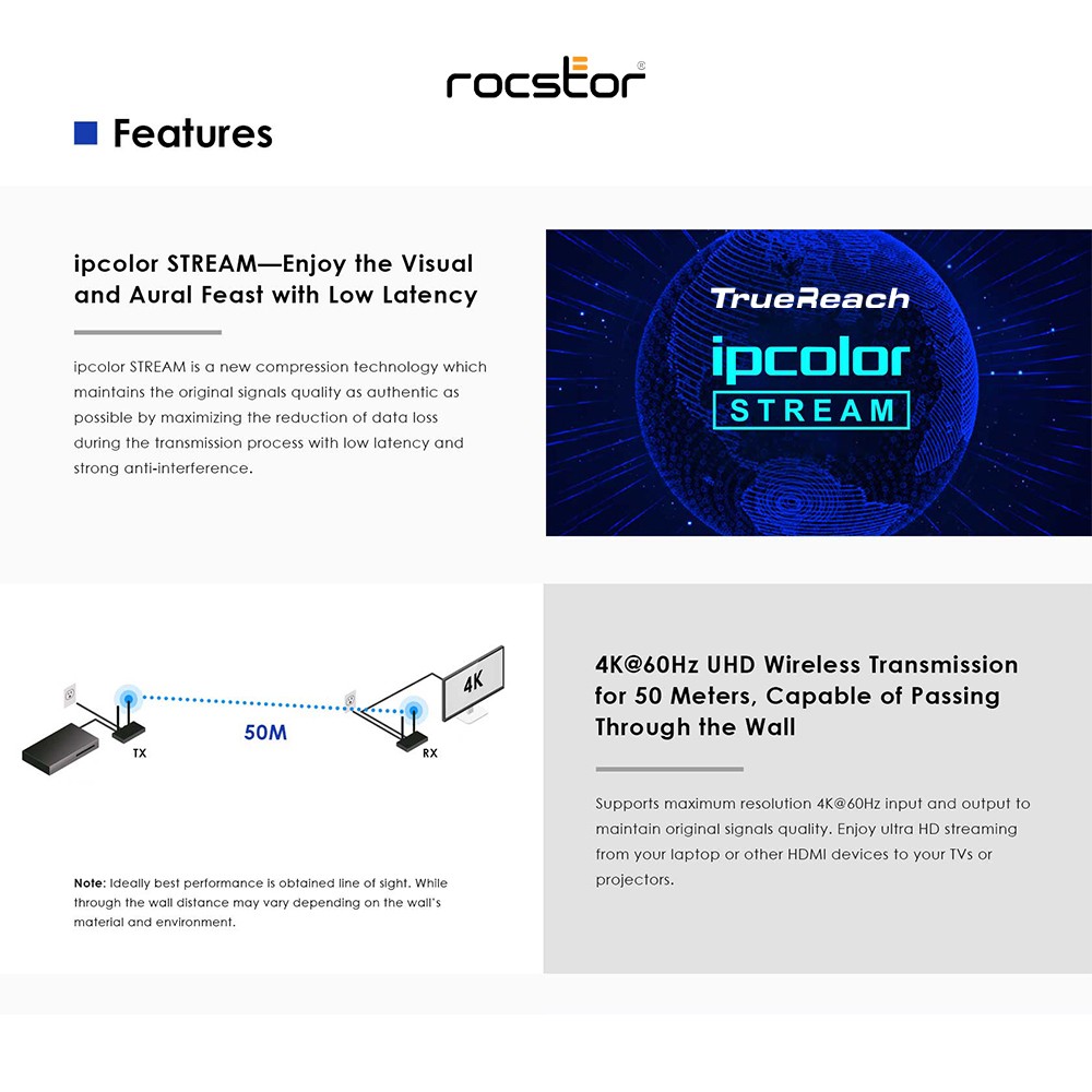 Marketing Information Experience the freedom of wireless HDMI connectivity with the Rocstor TrueReach 4K@60Hz HDMI over Wireless Extender. This advanced extender allows you to transmit stunning 4K 60Hz video signals wirelessly, eliminating the need for long HDMI cables. With its impressive range of up to 164ft (50m), it provides flexible and convenient installation options for your audiovisual setup.