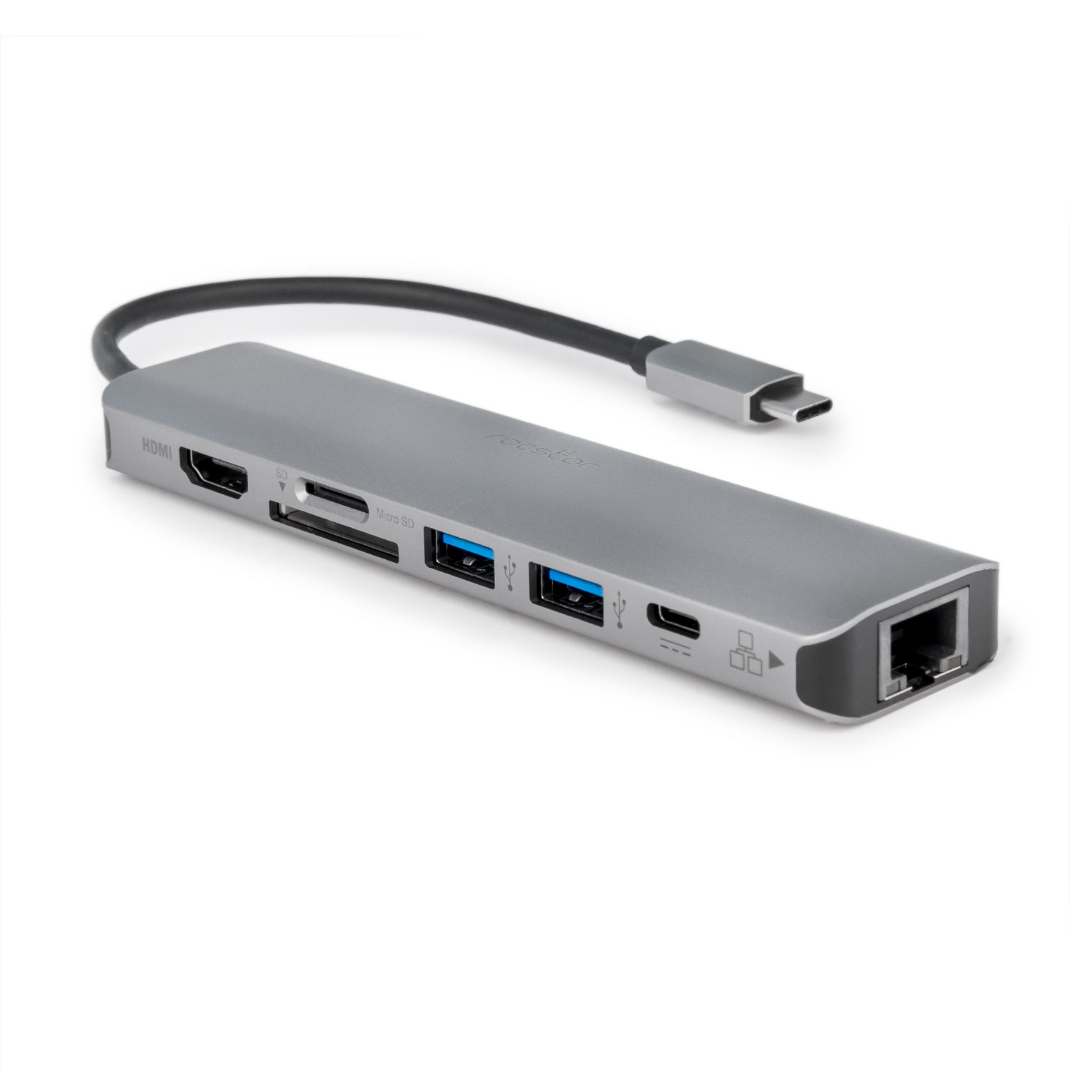 Rocstor Premium USB-C Multiport Adapter – 7-in-1 Hub – USB Type-C Slim Dock to 4K 60Hz HDMI, 1x USB-C with Up to 100W Power Delivery PD 3.0 Pass-Through, 2x USB 3.0 Type A Hub, SD (SD/SDXC/SDHC) Reader, Micro SD Reader – Gigabit Ethernet GbE RJ45, – Mini Laptop Dock – Driverless – Windows®, macOS®, Chrome OS® – Compatible with Thunderbolt® 3/4 USB-C laptop, Ultrabook, Chromebook® – MacBook® Pro, MacBook Air®, Lenovo®, Dell® – Aluminum