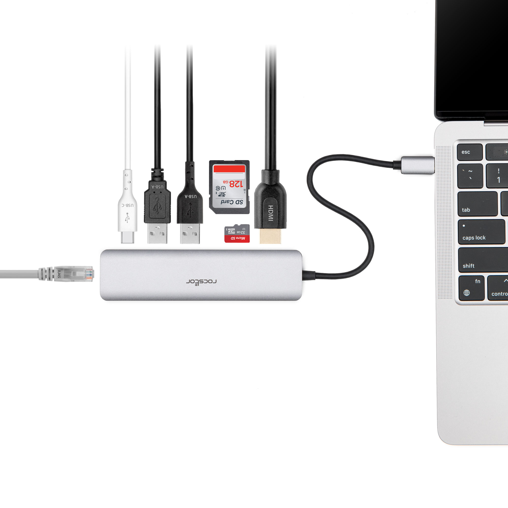 Rocstor Premium USB-C Multiport Adapter increases the functioning capability of your USB-C equipped laptops by connecting it to multiple peripherals simultaneously such as mouse, keyboard, display monitor, and Ethernet cable. Eliminating the need of carrying different port adapters. This stylish aluminum slim USB-C adapter allows you to convert your laptop into a workstation no matter where you are. It provides a 4K @ 60Hz Ultra high-resolution HDMI port, two USB 3.0 Type-A ports, one Gigabit Ethernet port and one SD card reader slot, making a laptop docking station at home or work.