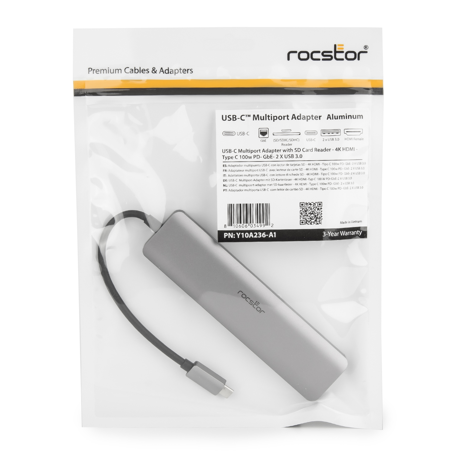 | Marketing Information | Rocstor Premium USB-C Multiport Adapter increases the functioning capability of your USB-C equipped laptops by connecting it to multiple peripherals simultaneously such as mouse, keyboard, display monitor, and Ethernet cable. Eliminating the need of carrying different port adapters. This stylish aluminum slim USB-C adapter allows you to convert your laptop into a workstation no matter where you are. It provides a 4K @ 60Hz Ultra high-resolution HDMI port, two USB 3.0 Type-A ports, one Gigabit Ethernet port and one SD card reader slot, making a laptop docking station at home or work.