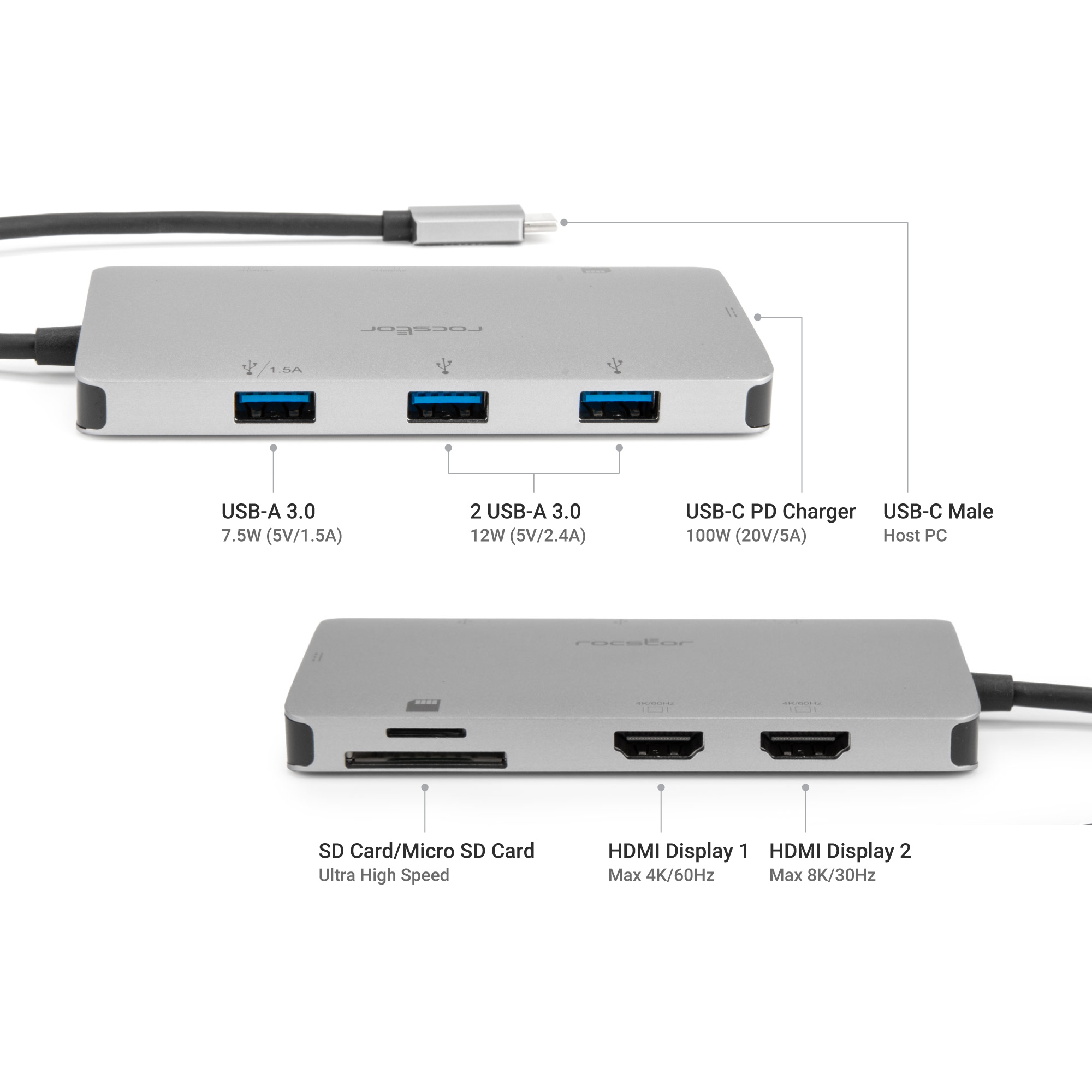 Featuring advanced DisplayPort 1.4 Alt mode technology, the Rocstor Multiport Adapter supports HDMI video output up to 8k/30Hz or dual 4k/30Hz, while also allowing USB 3.1 data transfer speeds up to 5Gbps. The dual HDMI ports enable users to enhance productivity with dual 4K/60Hz SST mode or dual 4K/30Hz MST mode, catering to various display needs. The 3 USB-A ports allow the simultaneous connection of multiple USB devices, expanding functionality further. Additionally, the hub includes SD/Micro SD card slots for the concurrent use of two cards, facilitating smooth data transmission.