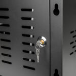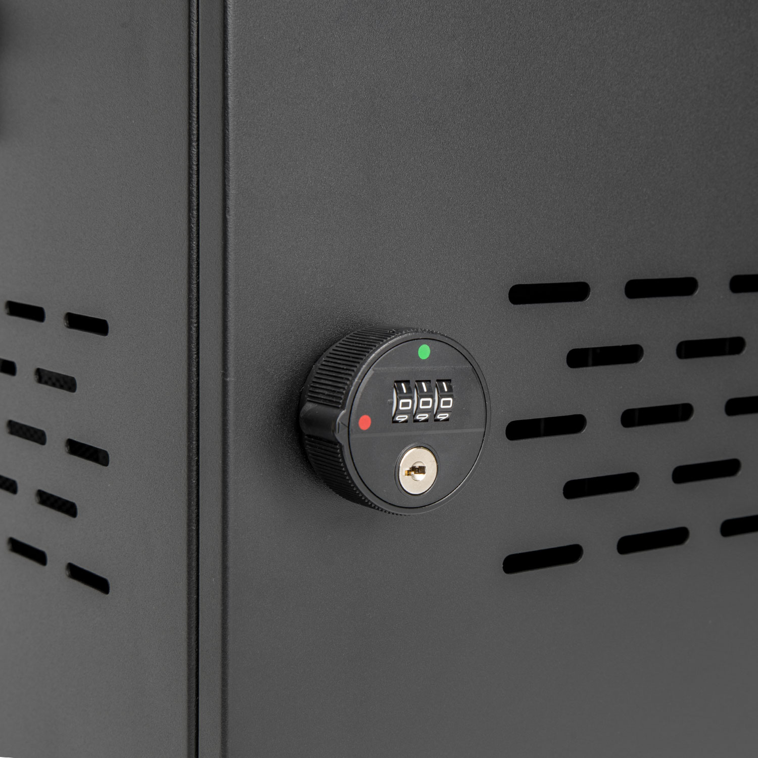 - Secure Construction: Heavy-duty steel cabinet with locking front door and combination lock.