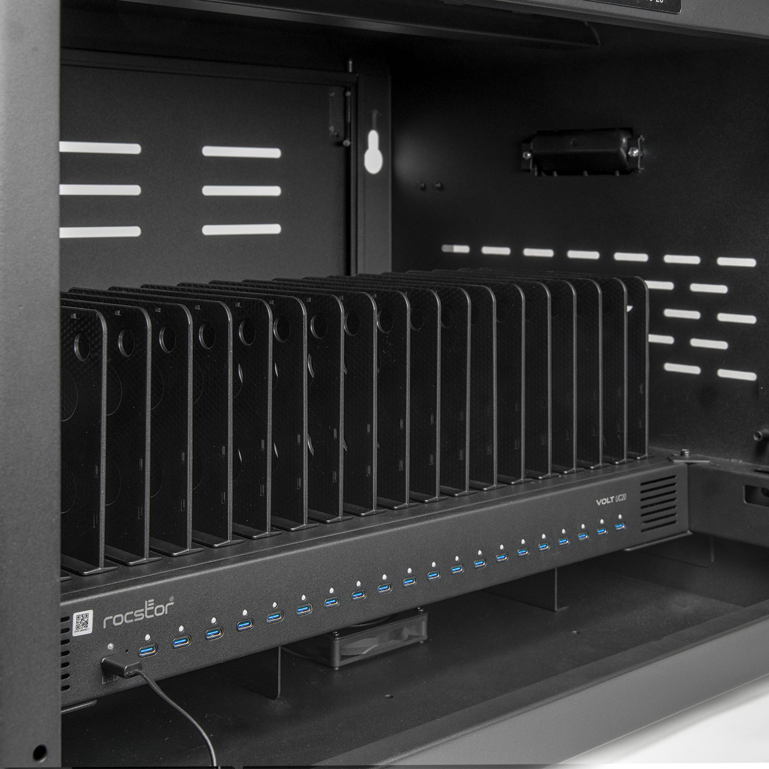 Beyond its hardware, the Volt UC20 delivers intelligent management with Rocstor’s free mobile app for iOS and Android. This wireless monitoring feature allows IT administrators and managers to view charging activity in real-time, providing centralized oversight and greater efficiency. Combined with its advanced airflow ventilation and low-noise fans, the UC20 offers safe, quiet, and reliable operation—perfect for classrooms, clinics, offices, and industrial spaces where performance and organization are critical.