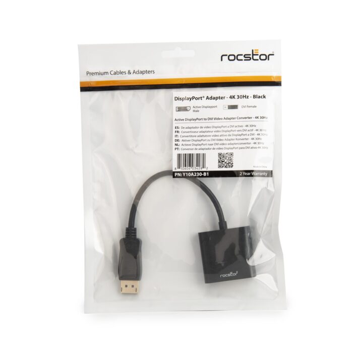 Rocstor’s Active DisplayPort® to DVI 4K converts a DisplayPort computer output to single link DVI. For a clear and high-resolution quality images use this premium adapter which supports uncompressed High-Definition digital video up to 4K and up to 3840×2160 resolution at 30Hz. Additionally, it boasts a flexible design with good bending radius to ease cable management.