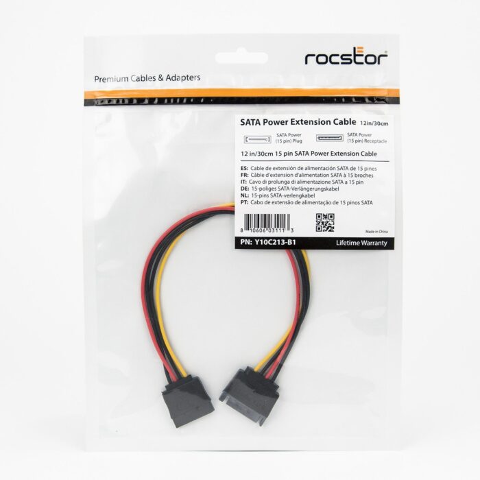 Rocstor Premium 12in 15 Pin Extension Cable will allow you to extend the reach between the internal SATA power and drive connections by up to 12 inches. An easy way to ease drive installation by conquering the typical connection limitations and will lessen the risk of damage to the drive or motherboard SATA connectors because the need to add stress on the cable will be excluded. Backed by Rocstor Lifetime Warranty.